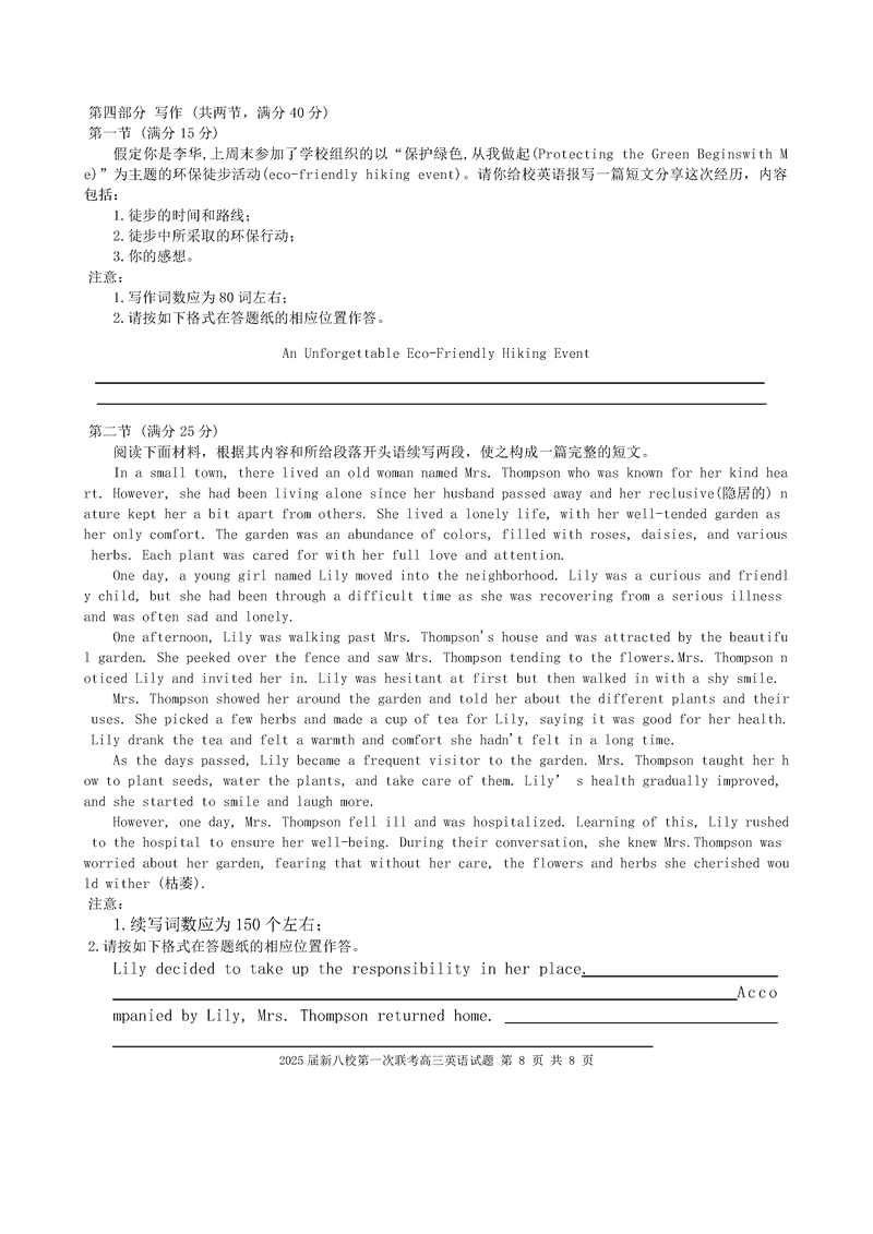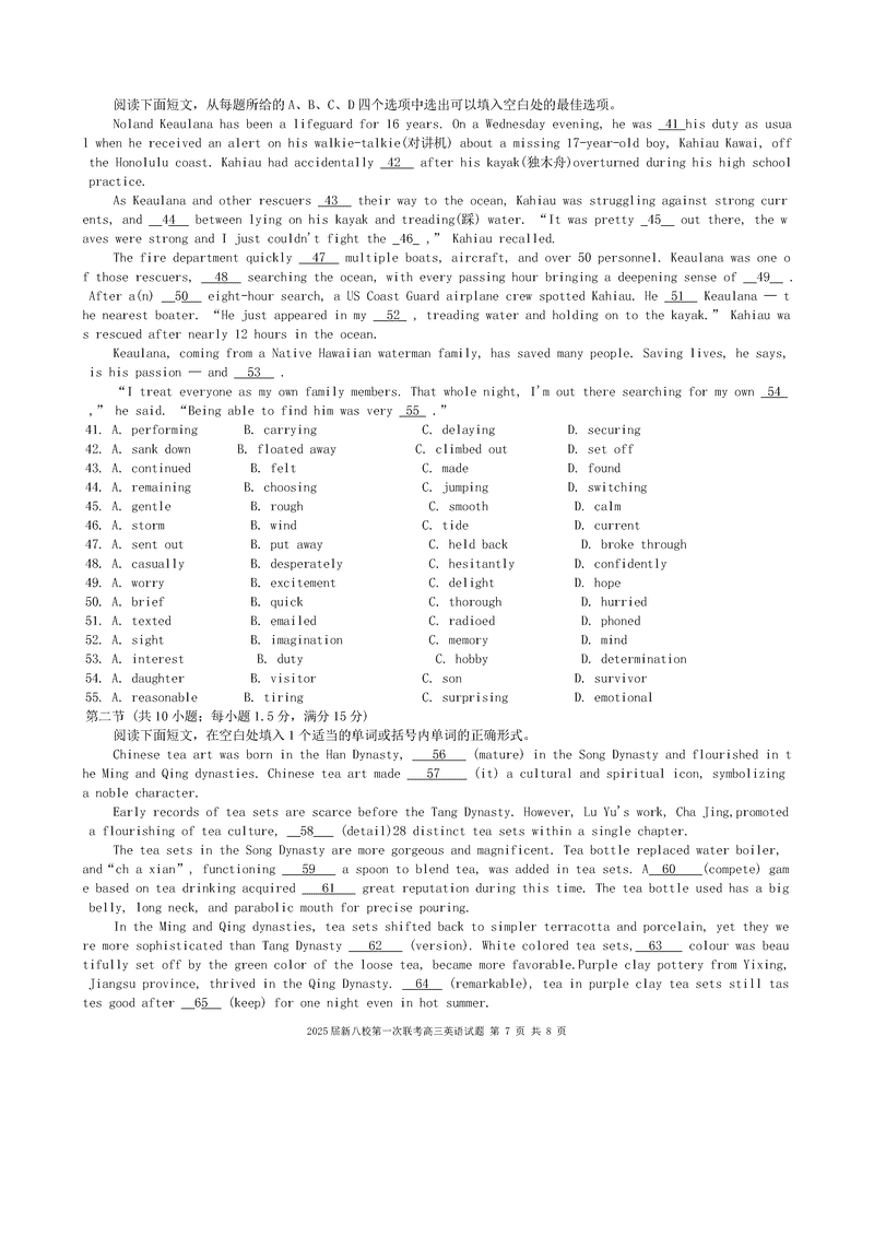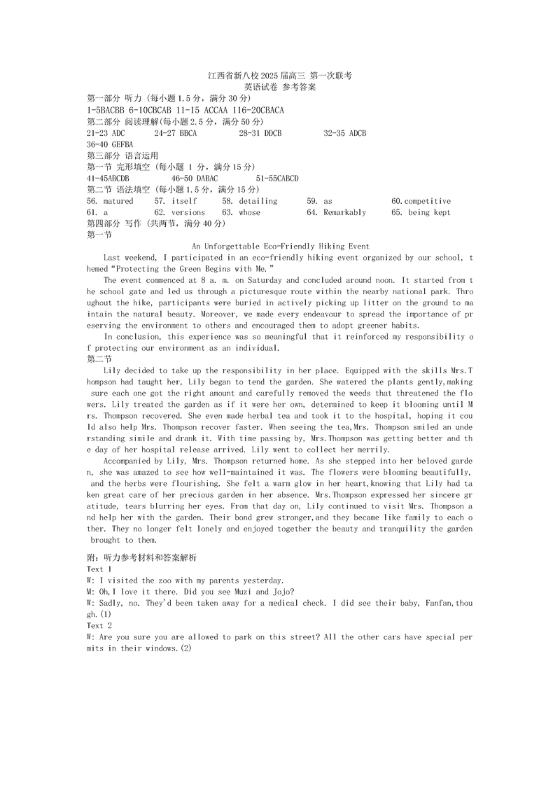江西省新八校2025届高三第一次联考英语试题及答案 时间:2025-01-27 江西 英语试题 江西省新八校2025届高三第一次联考英语考试已于近日开考,为方便考生考后及时查看考试情况,查漏补缺、弥补不足,本文整理了试题答案解析相关信息! 汇总:江西省新八校2025届高三第一次联考试题及答案汇总 英语试题及答案解析