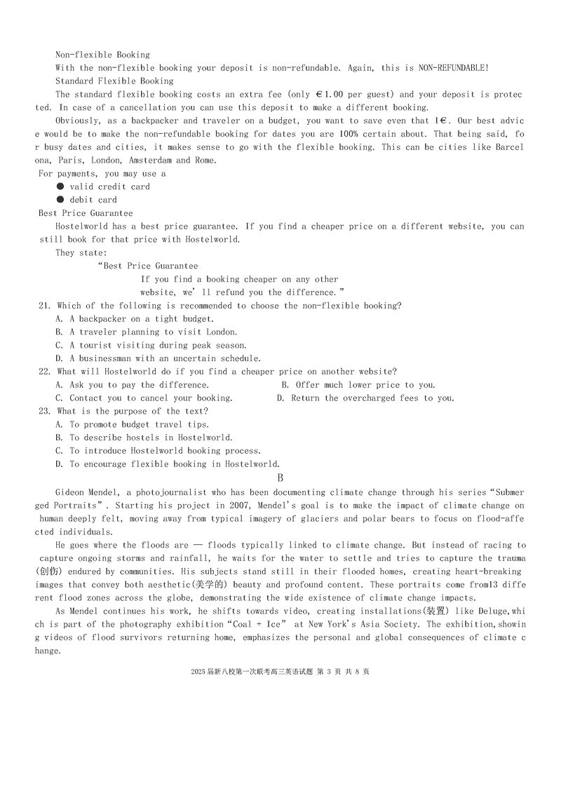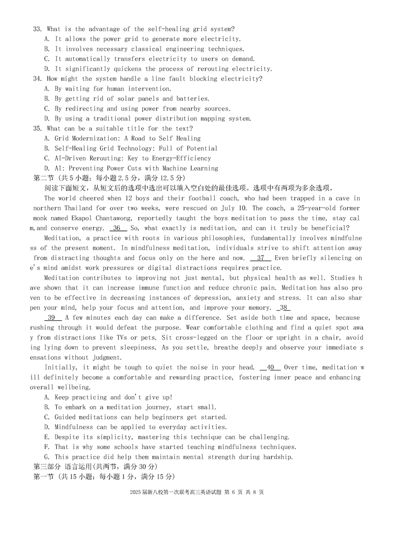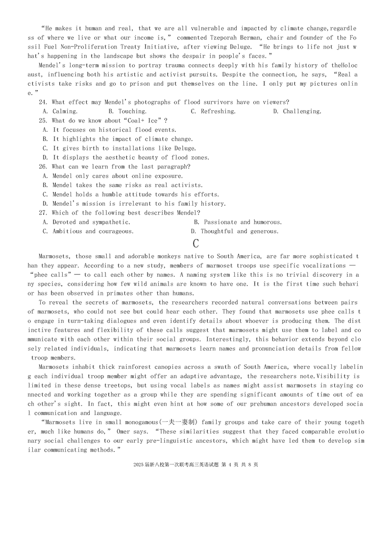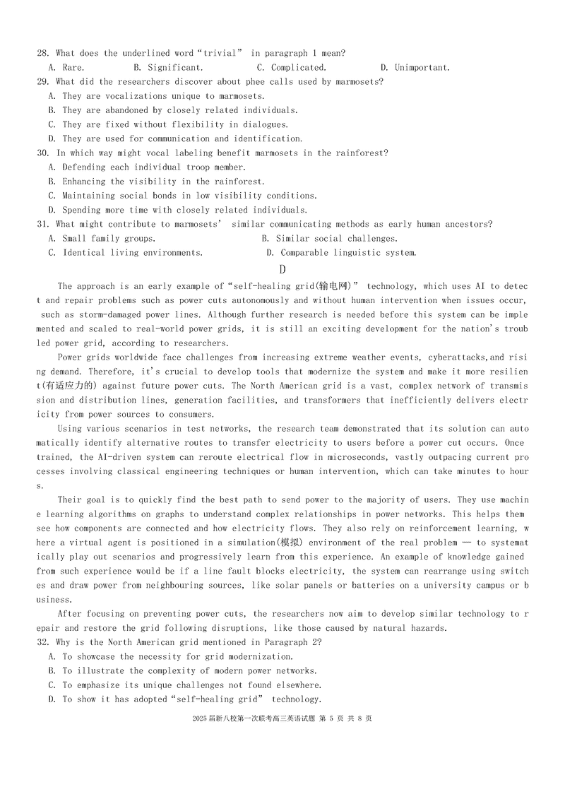 江西省新八校2025届高三第一次联考英语试题及答案 时间:2025-01-27 江西 英语试题 江西省新八校2025届高三第一次联考英语考试已于近日开考,为方便考生考后及时查看考试情况,查漏补缺、弥补不足,本文整理了试题答案解析相关信息! 汇总:江西省新八校2025届高三第一次联考试题及答案汇总 英语试题及答案解析
