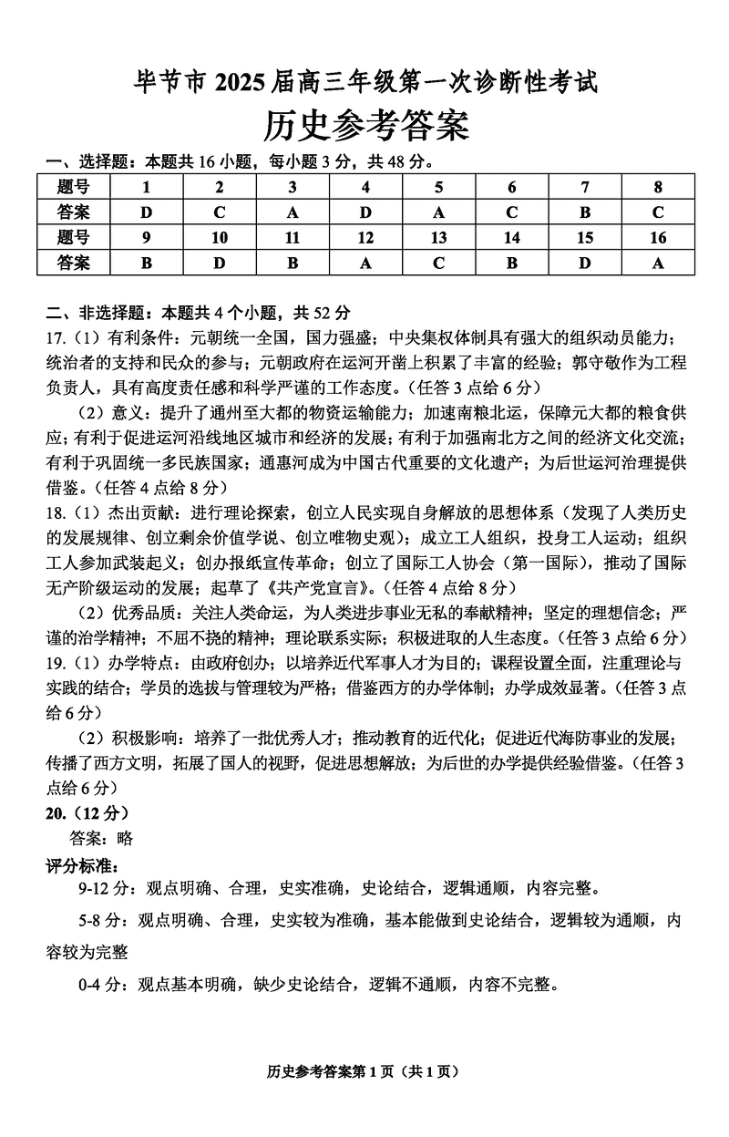毕节一诊2025届高三上学期第一次诊断历史考试已于近日开考,为方便考生考后及时查看考试情况,查漏补缺、弥补不足,本文整理了试题答案解析相关信息!