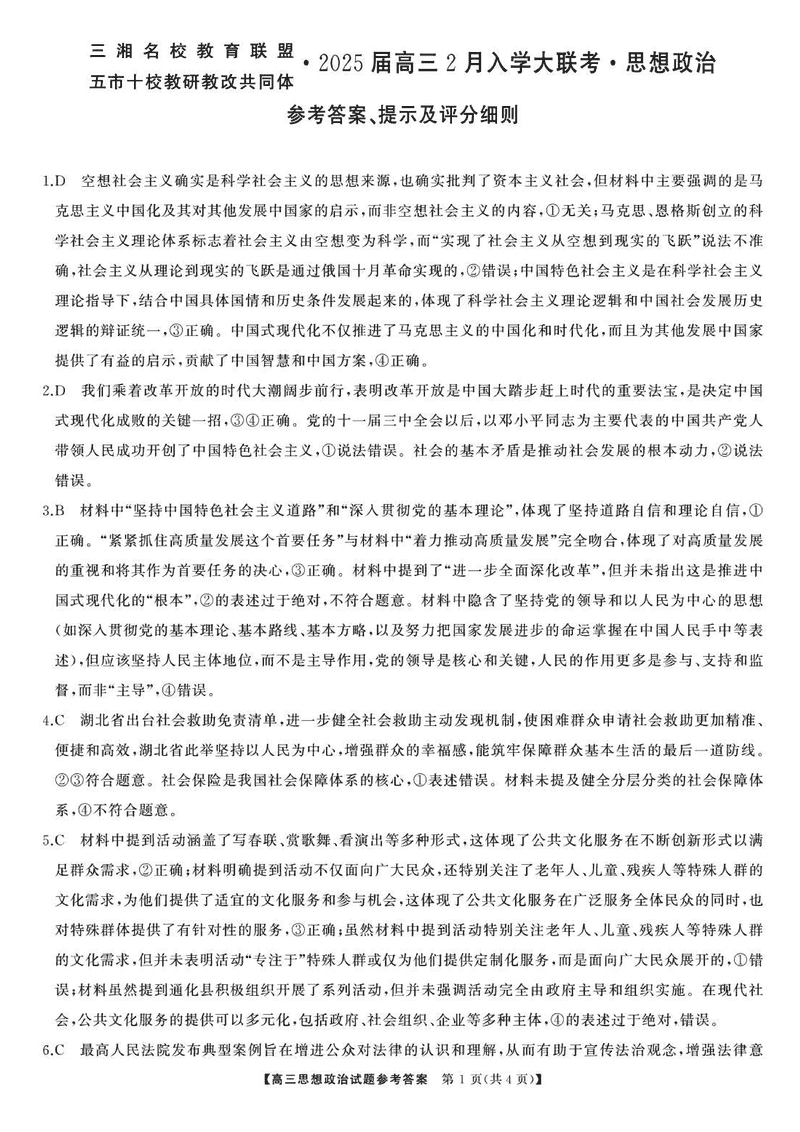2025届三湘名校教育联盟五市十校教研教改共同体高三下2月入学大联考政治试题及答案