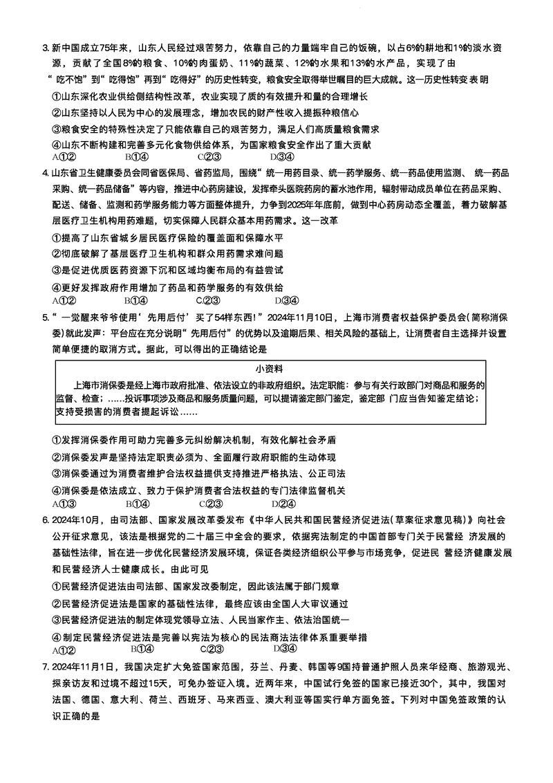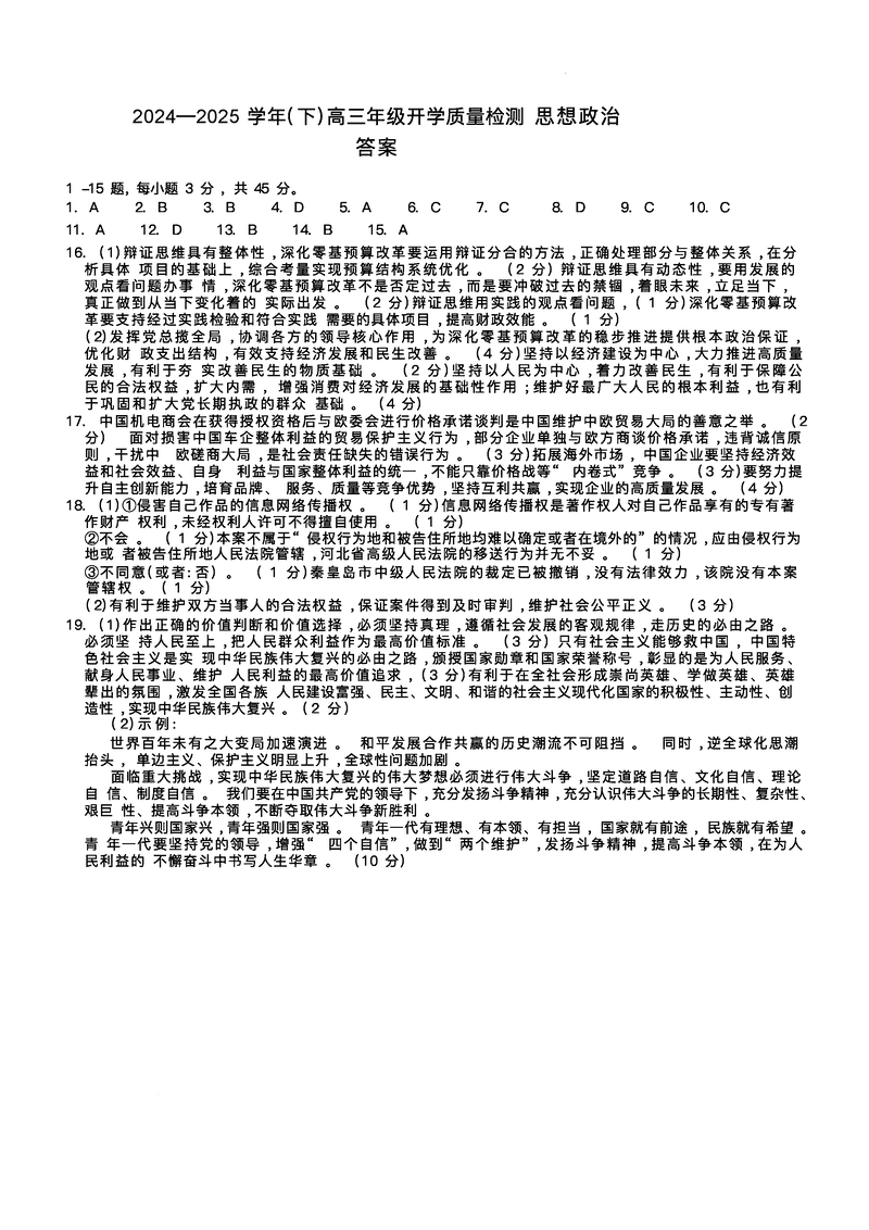 山东天一大联考齐鲁名校教研共同体2025年高三下开学质检政治试题及答案