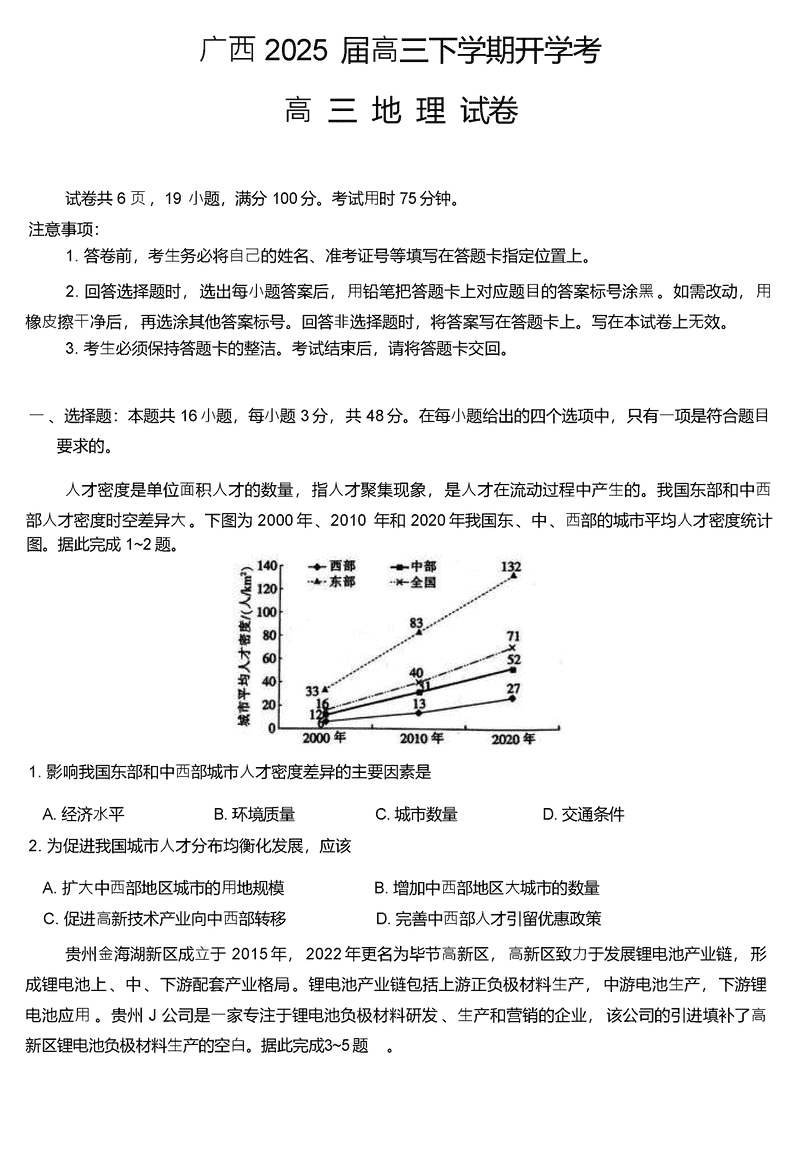 2025届广西上进联考高三下学期2月开学地理试题及答案