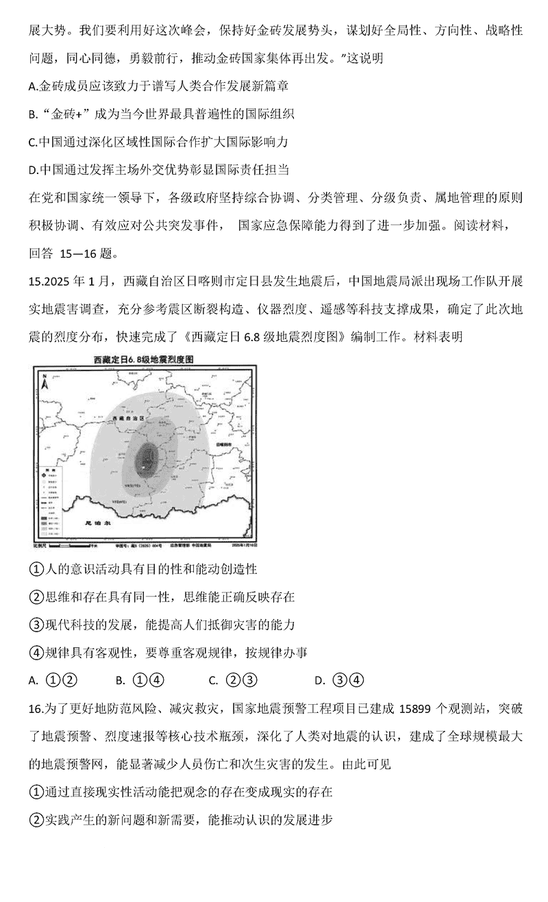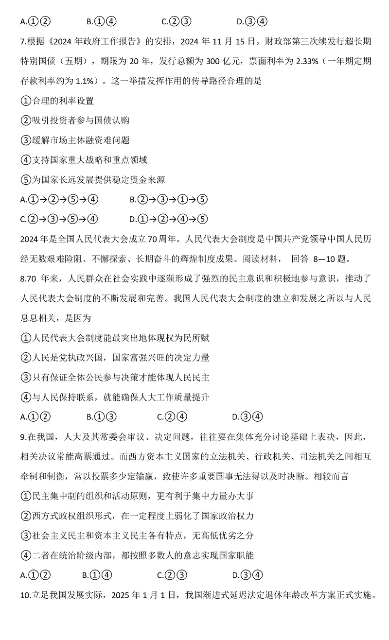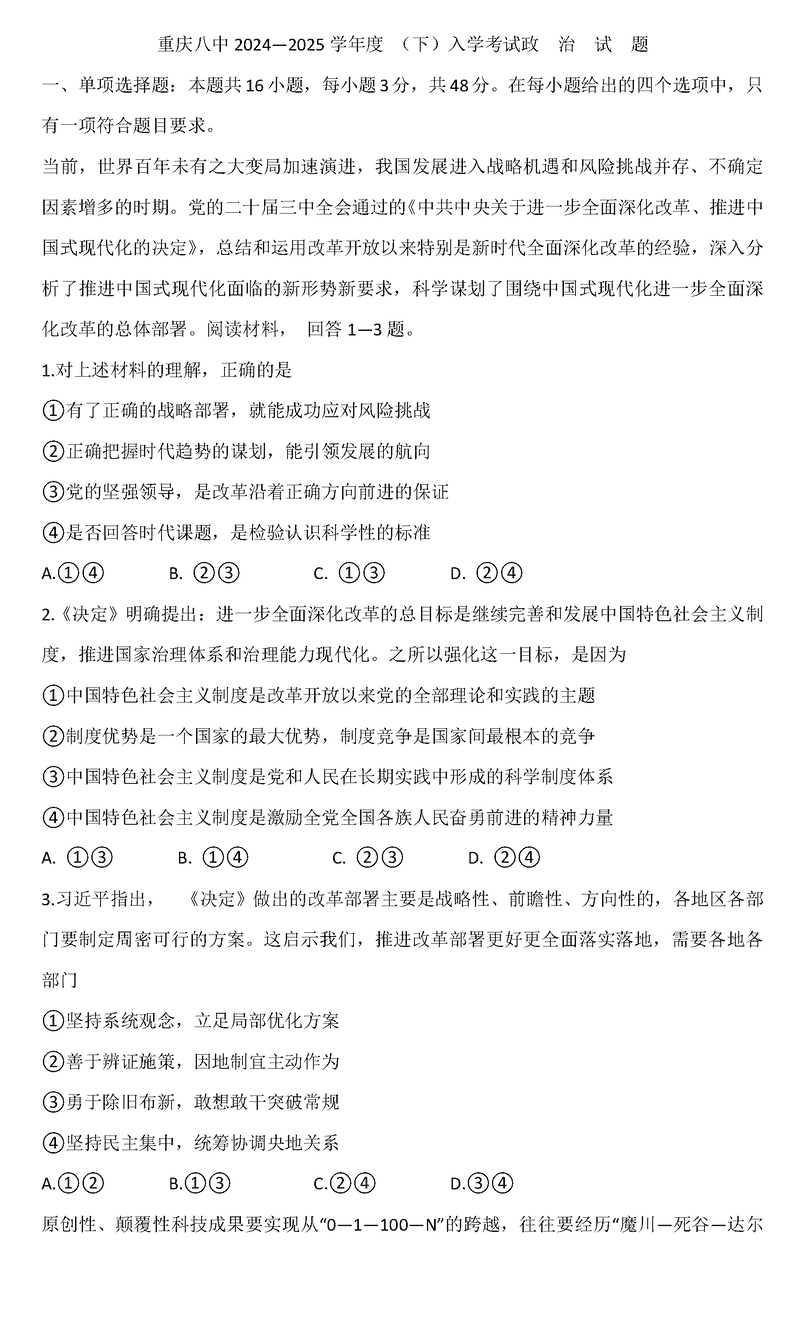 重庆八中2024-2025学年度高三下入学政治试题及答案