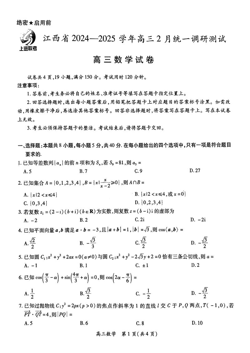 江西上进联考2024-2025学年高三下学期2月统测数学考试已于近日开考,为方便考生考后及时查看考试情况,查漏补缺、弥补不足,本文整理了试题答案解析相关信息!