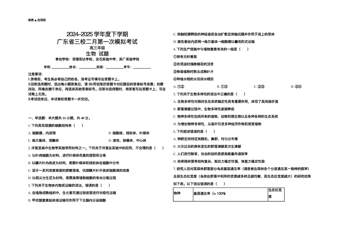 2025届广东三校高三下学期2月第一次模考生物考试已于近日开考,为方便考生考后及时查看考试情况,查漏补缺、弥补不足,本文整理了试题答案解析相关信息!