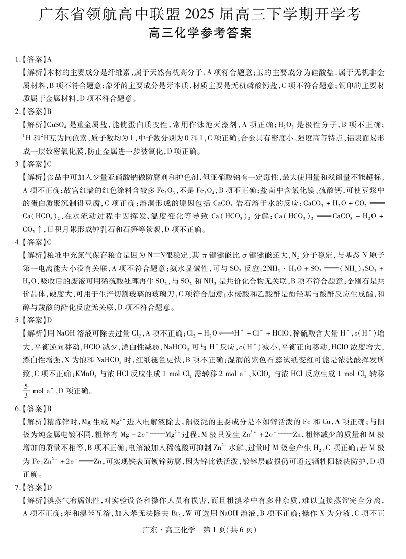 广东省领航高中联盟2025届高三下学期2月开学考化学考试已于近日开考,为方便考生考后及时查看考试情况,查漏补缺、弥补不足,本文整理了试题答案解析相关信息!