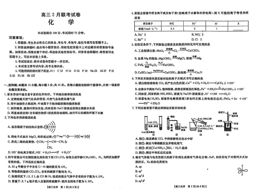 湖北鄂东新领先协作体2025届高三下学期2月联考化学试题及答案