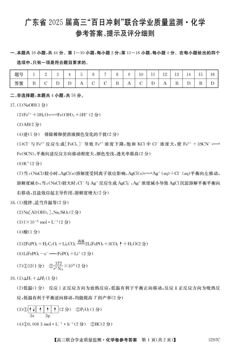 广东省2025届高三"百日冲刺"联合学业质量监测化学考试已于近日开考,为方便考生考后及时查看考试情况,查漏补缺、弥补不足,本文整理了试题答案解析相关信息!