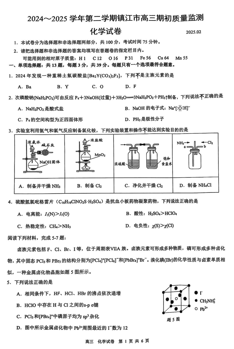 江苏镇江2024-2025学年高三下学期期初质量监测化学试题及答案