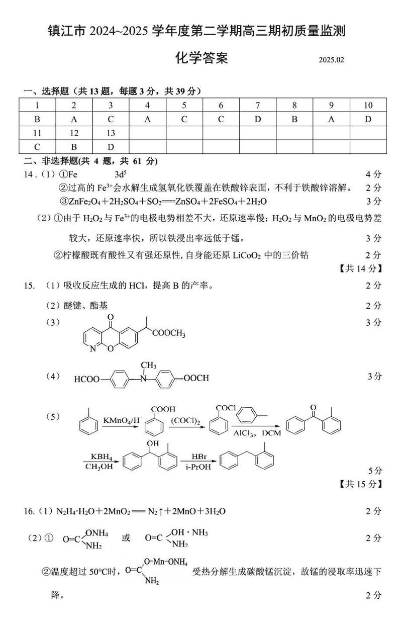 江苏镇江2024-2025学年高三下学期期初质量监测化学考试已于近日开考,为方便考生考后及时查看考试情况,查漏补缺、弥补不足,本文整理了试题答案解析相关信息!