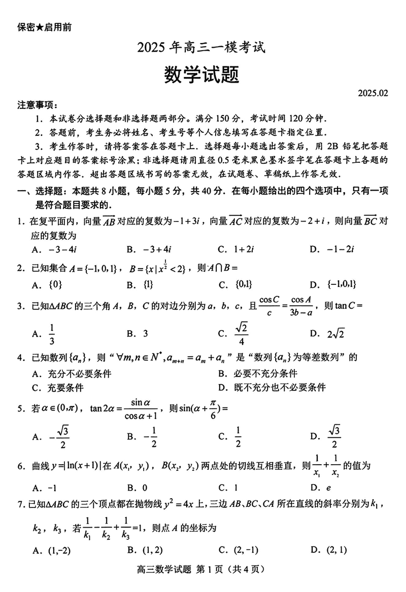 山东菏泽2025年高三一模数学试题及答案 时间:2025-02-27 山东 数学试题 山东菏泽2025年高三一模数学考试已于近日开考,为方便考生考后及时查看考试情况,查漏补缺、弥补不足,本文整理了试题答案解析相关信息! 汇总:山东菏泽2025年高三一模考试试题及答案汇总 数学试题及答案解析