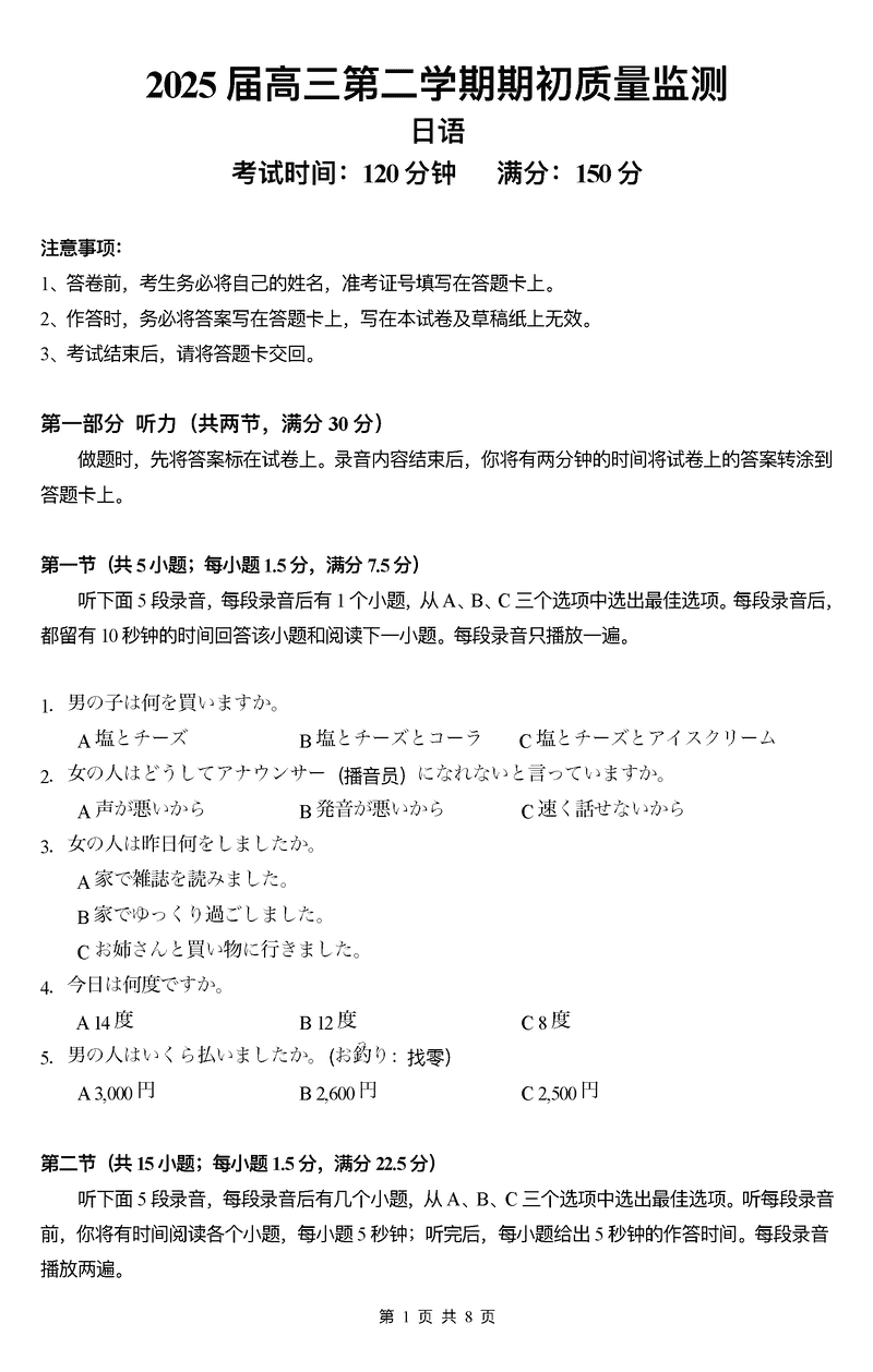 江苏省新高考基地学校2025届高三下学期期初质量监测日语考试已于近日开考,为方便考生考后及时查看考试情况,查漏补缺、弥补不足,本文整理了试题答案解析相关信息!