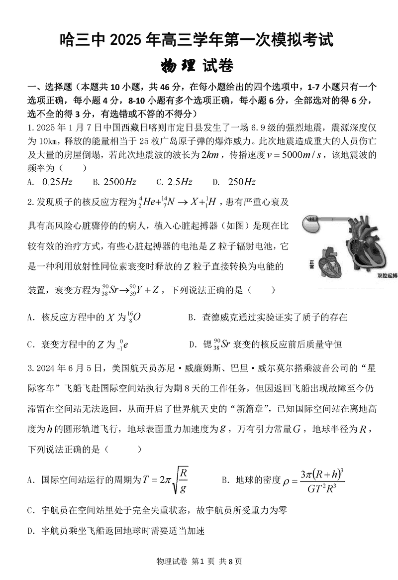 哈三中2025年高三学年第一次模考物理试题及答案 时间:2025-03-06 黑龙江 理综试题 哈三中2025年高三学年第一次模考物理考试已于近日开考,为方便考生考后及时查看考试情况,查漏补缺、弥补不足,本文整理了试题答案解析相关信息! 汇总:哈三中2025年高三学年第一次模拟考试试题及答案汇总 物理试题及答案解析
