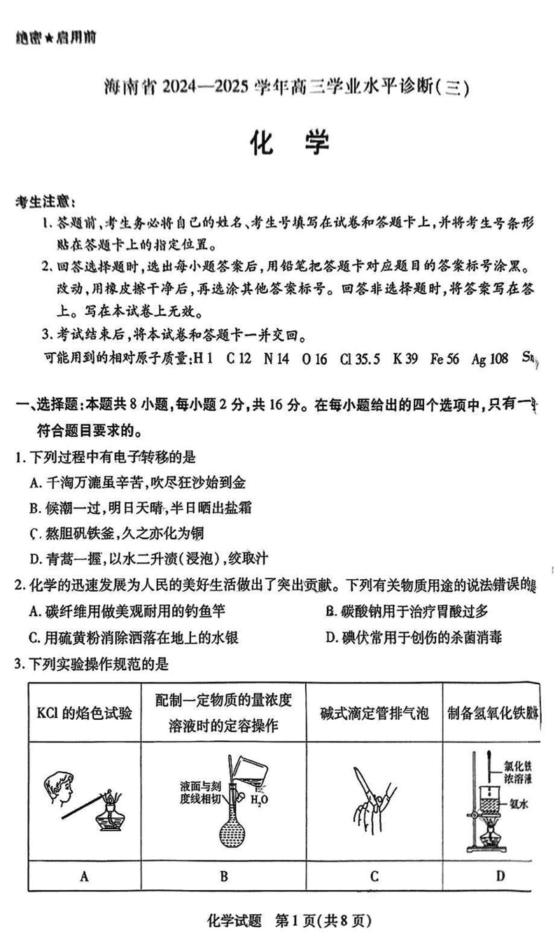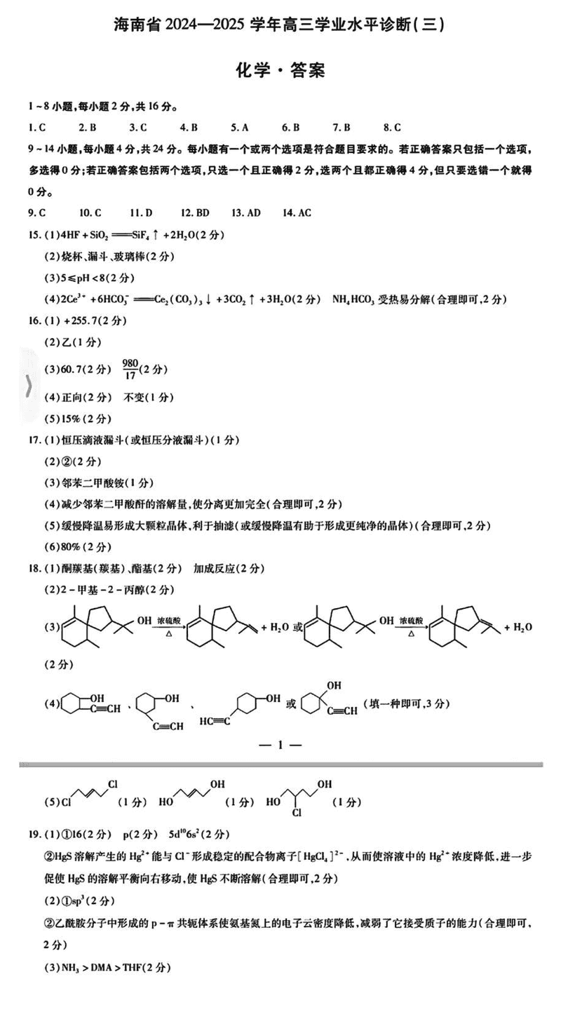 海南省天一大联考2024-2025学年高三学业水平诊断(三)化学考试已于近日开考,为方便考生考后及时查看考试情况,查漏补缺、弥补不足,本文整理了试题答案解析相关信息!