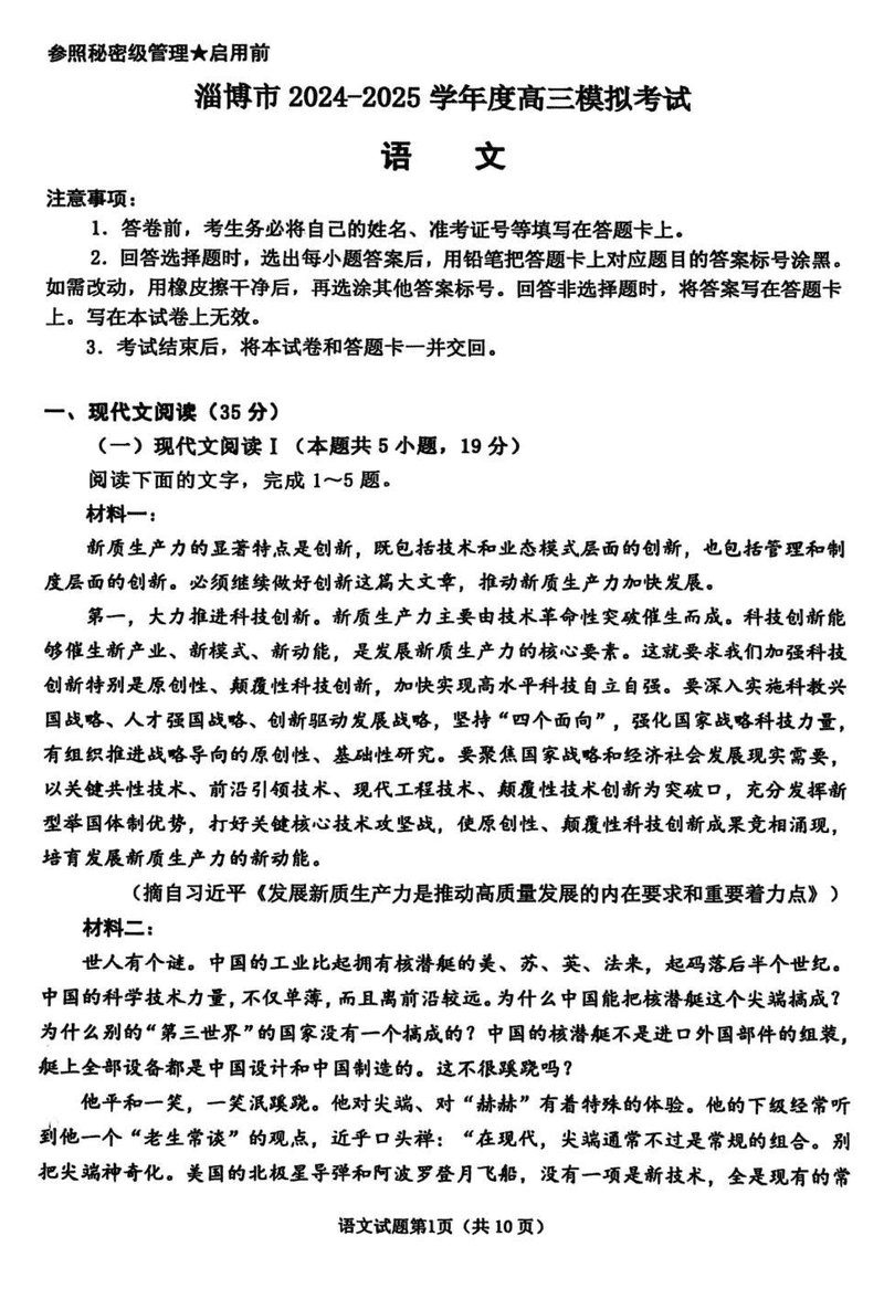淄博市、滨州市2025届高三下学期3月一模语文试题及答案
