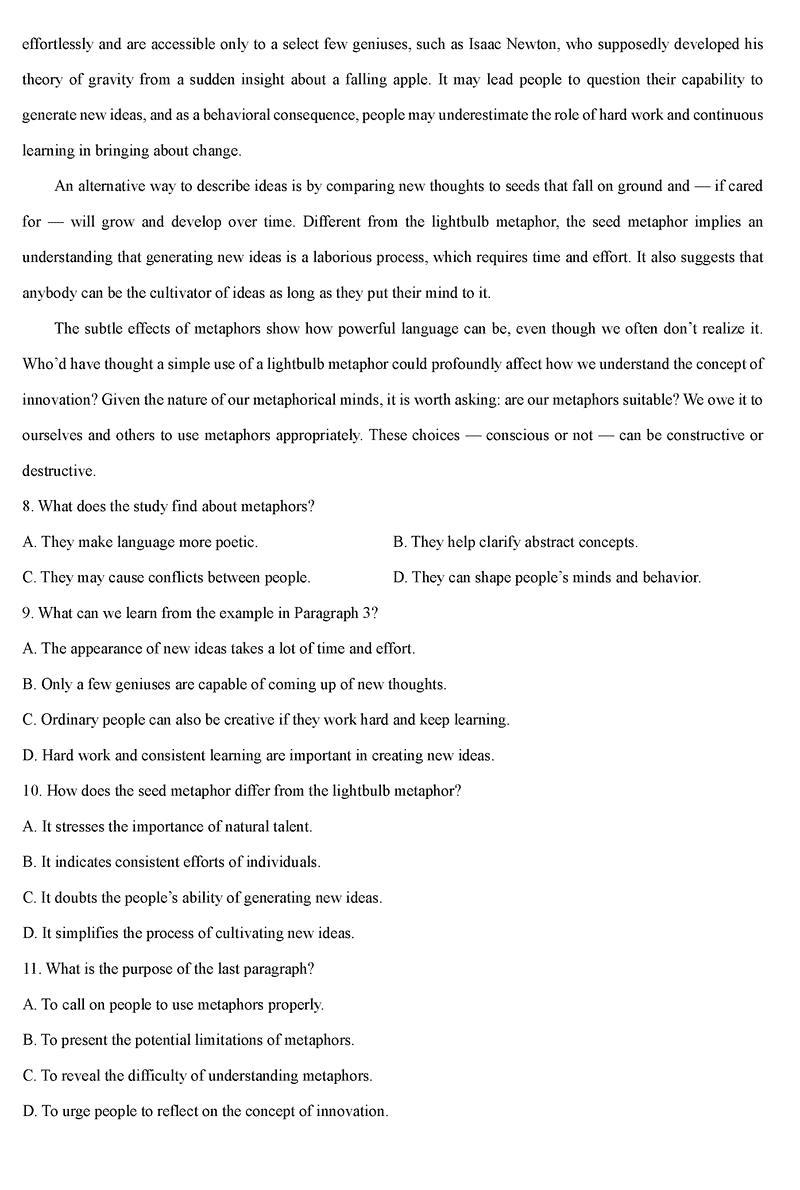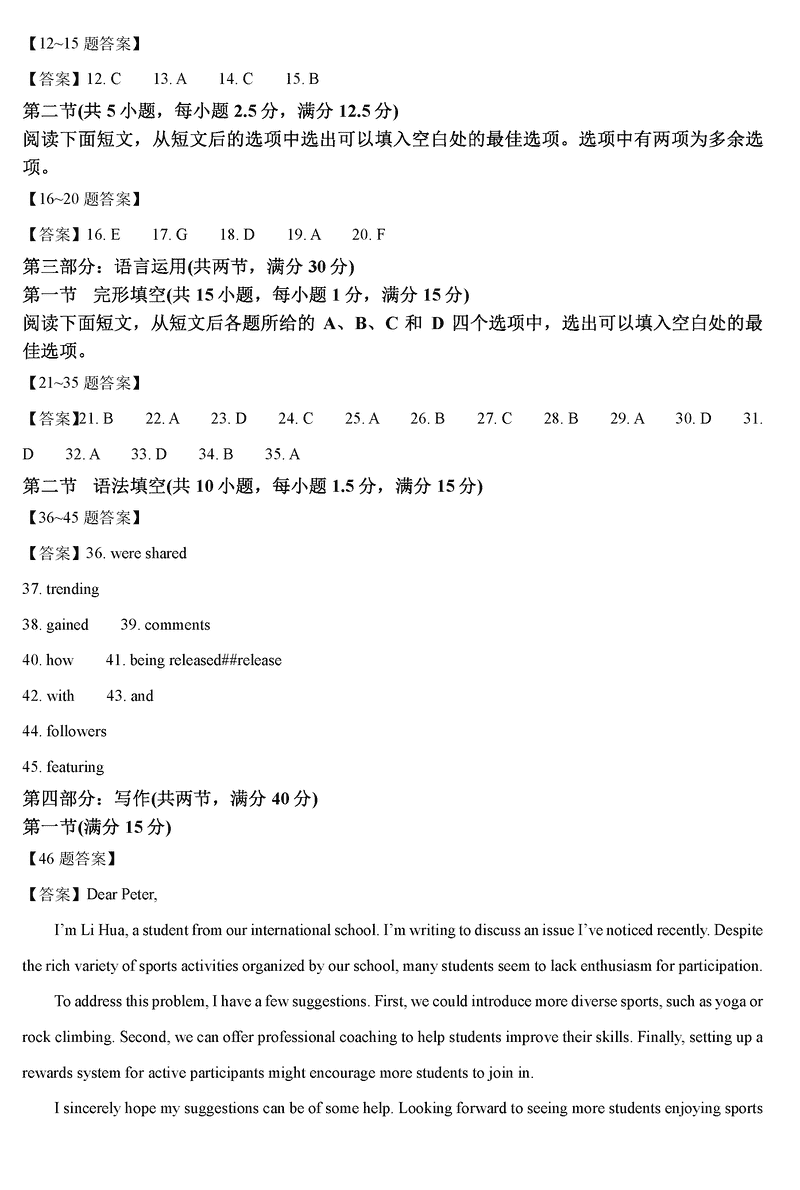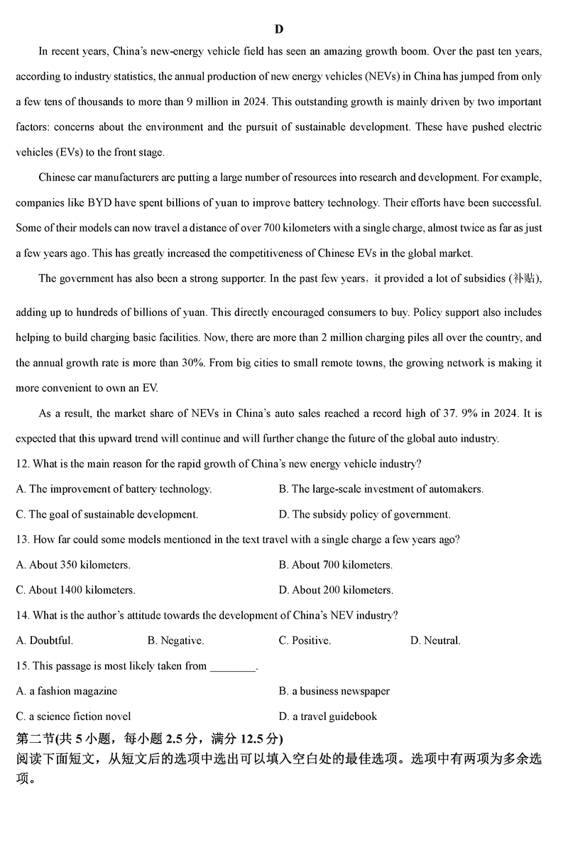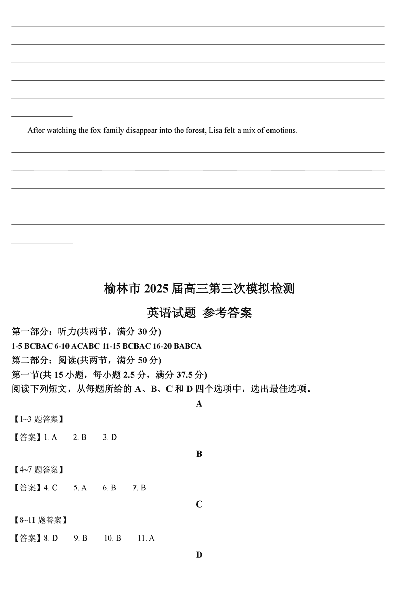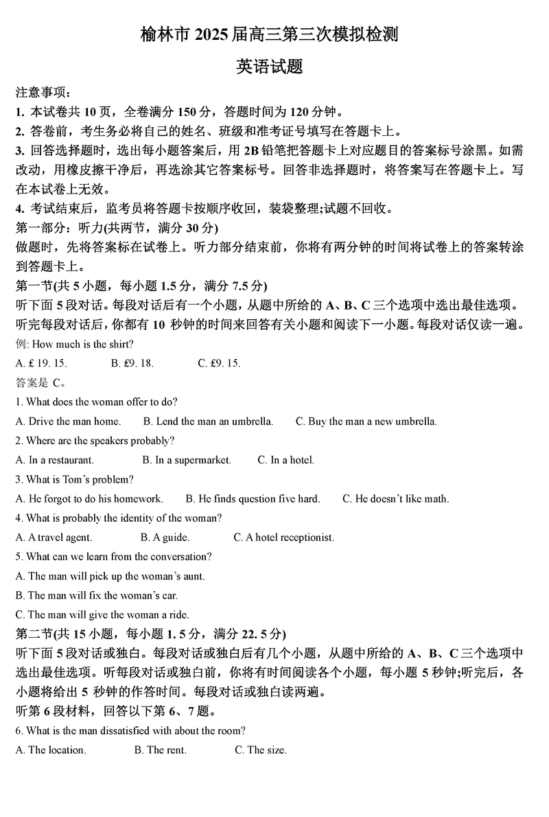 陕西榆林2025届高三第三次模拟检测英语试题及答案 时间:2025-03-11 陕西 英语试题 陕西榆林2025届高三第三次模拟检测英语考试已于近日开考,为方便考生考后及时查看考试情况,查漏补缺、弥补不足,本文整理了试题答案解析相关信息! 汇总:陕西榆林2025届高三第三次模拟检测试题及答案汇总 英语试题及答案解析