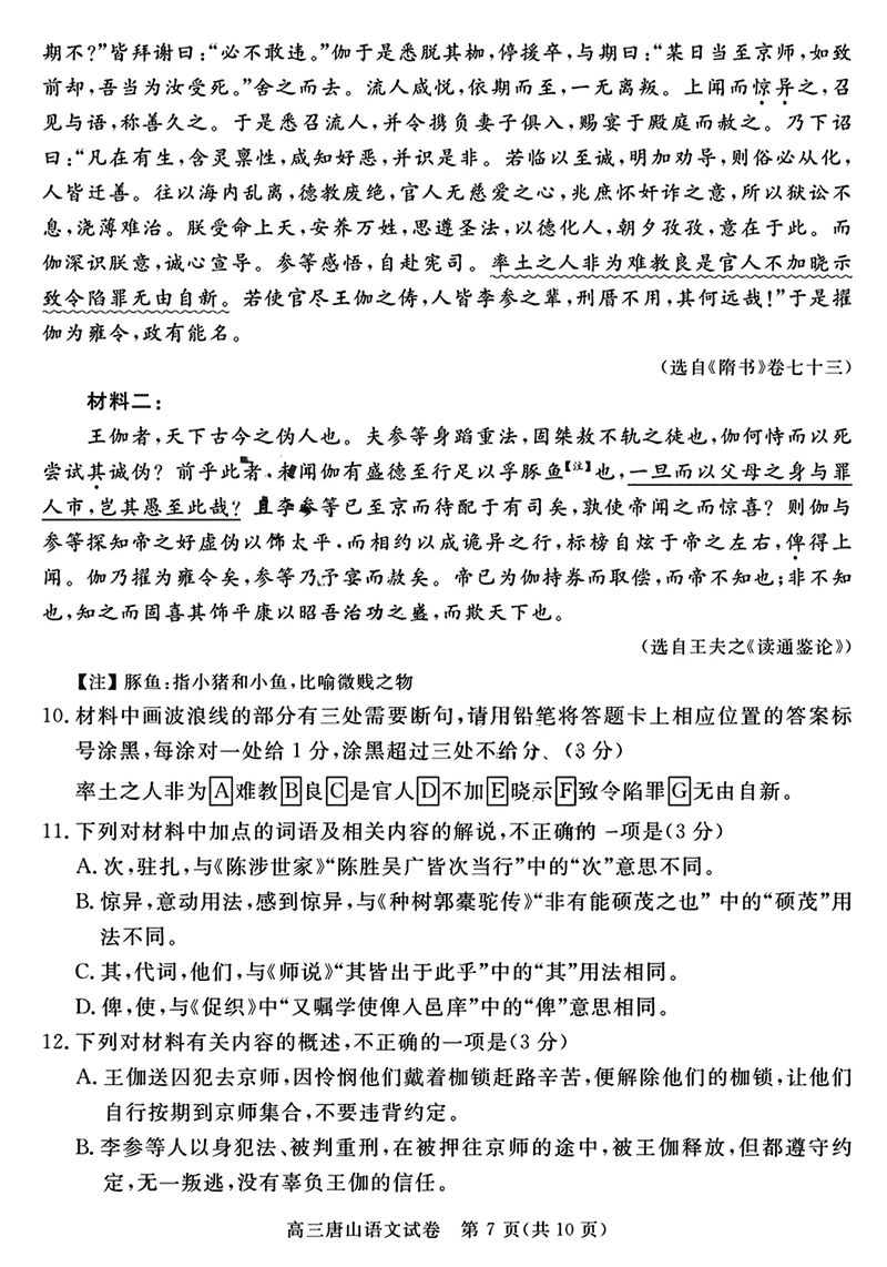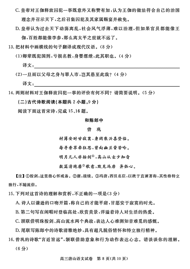 唐山一模2025年普通高等院校招生第一次拟演练语文试题及答案
