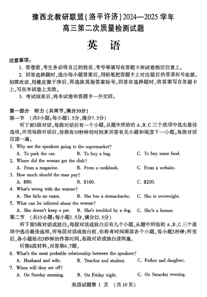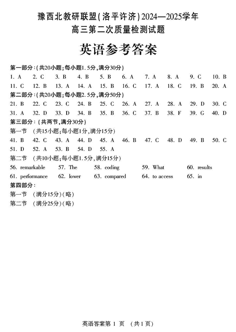 河南豫西北教研联盟(洛平许济)2025年高三下学期第二次质量检测英语考试已于近日开考,为方便考生考后及时查看考试情况,查漏补缺、弥补不足,本文整理了试题答案解析相关信息!