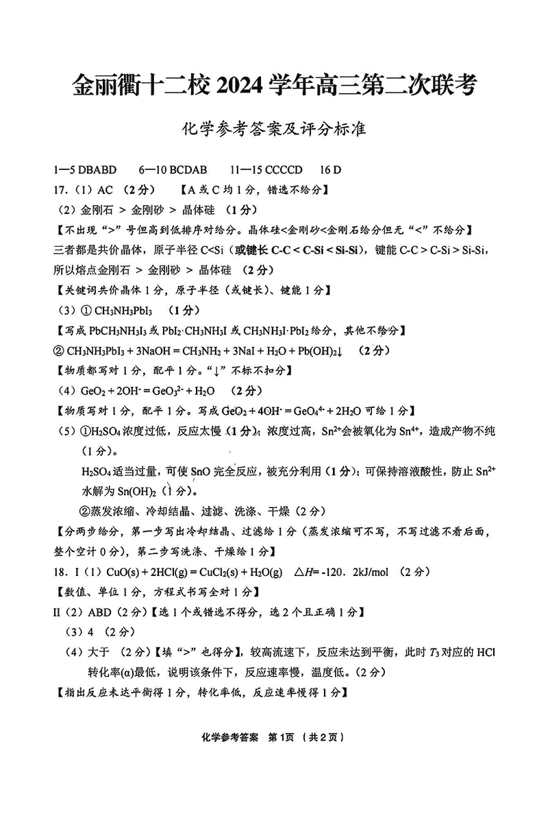 金丽衢十二校2025届高三第二次联考化学试题及答案