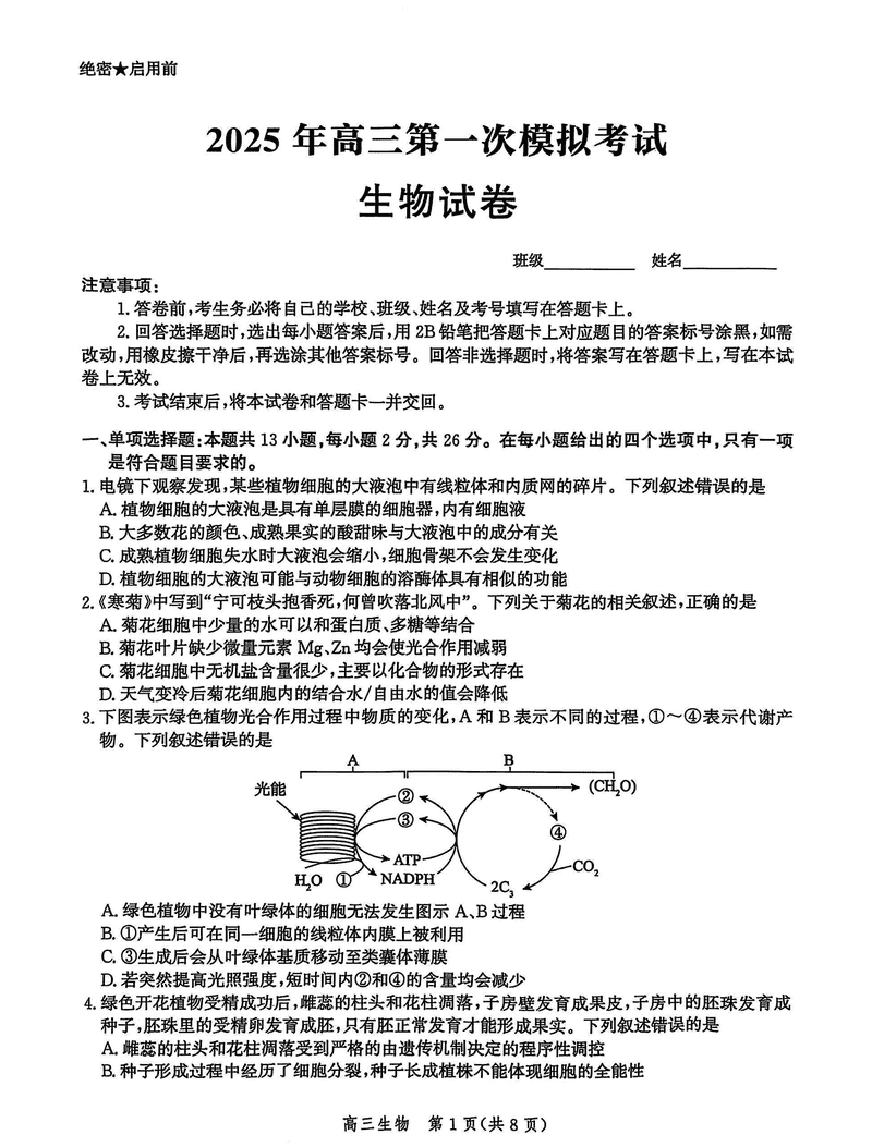 2025届河北沧衡八县联考一模生物试题及答案 时间:2025-03-16 河北 理综试题 2025届河北沧衡八县联考一模生物考试已于近日开考,为方便考生考后及时查看考试情况,查漏补缺、弥补不足,本文整理了试题答案解析相关信息! 汇总:2025届河北沧衡八县联考一模试题及答案汇总 生物试题及答案解析