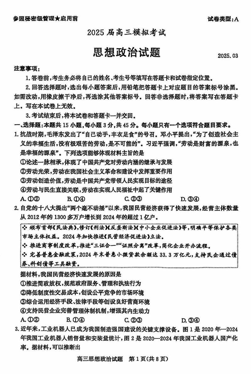 枣庄二调2025届高三模考政治试题及答案 时间:2025-03-20 山东 文综试题 枣庄二调2025届高三模考政治考试已于近日开考,为方便考生考后及时查看考试情况,查漏补缺、弥补不足,本文整理了试题答案解析相关信息! 汇总:枣庄二调2025届高三模拟考试试题及答案汇总 政治试题及答案解析