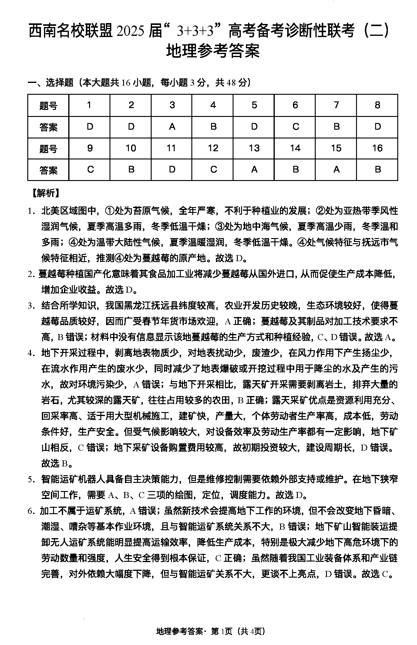 西南名校联盟2025届“3+3+3”高考备考诊断性联考 (二)地理试题及答案汇总