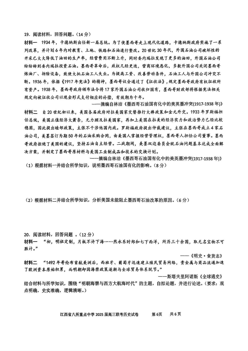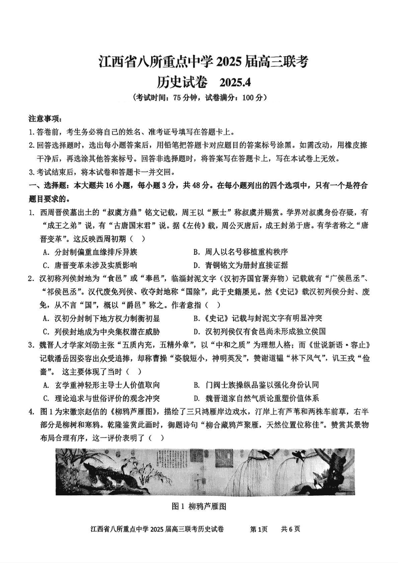江西省八所重点中学2025届高三4月联考历史试题及答案