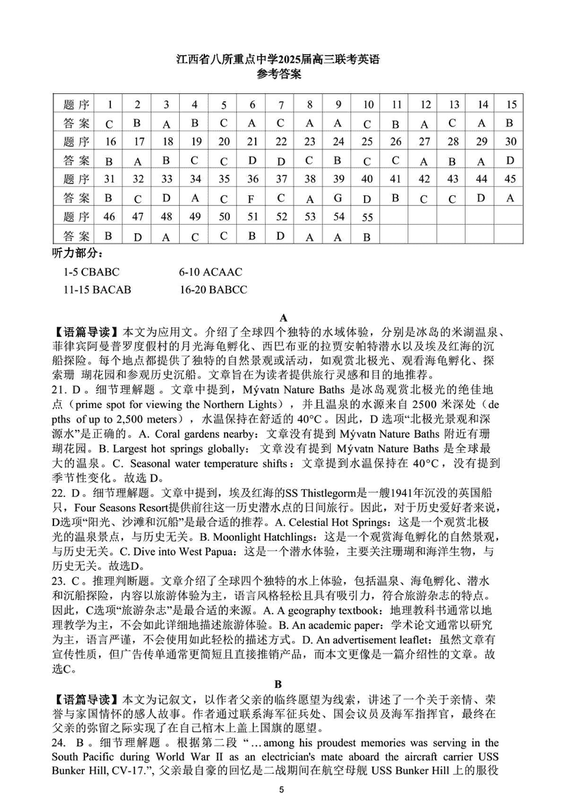 江西省八所重点中学2025届高三下学期4月二模联考英语考试已于近日开考,为方便考生考后及时查看考试情况,查漏补缺、弥补不足,本文整理了试题答案解析相关信息!