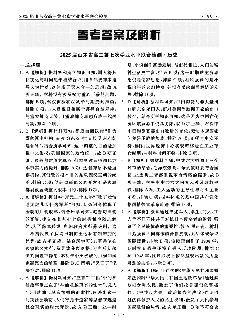 山东省齐鲁名校大联考2025届高三第七次学业水平联合检测历史试题及答案