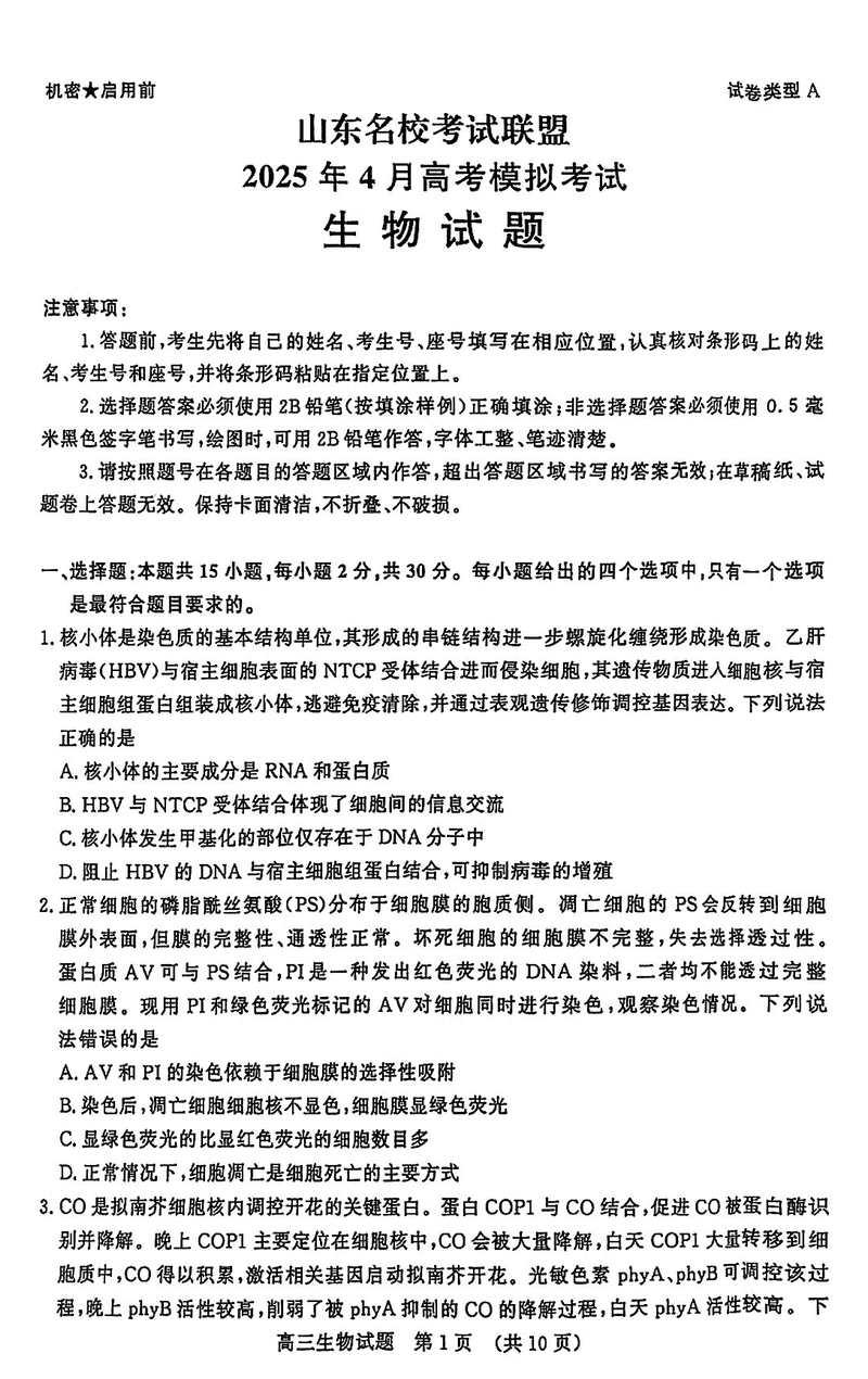 山东名校考试联盟2025年高三4月模考生物试题及答案 时间:2025-04-23 山东 理综试题 山东名校考试联盟2025年高三4月模考生物考试已于近日开考,为方便考生考后及时查看考试情况,查漏补缺、弥补不足,本文整理了试题答案解析相关信息! 汇总:山东名校考试联盟2025年高三4月模考试题及答案汇总 生物试题及答案解析