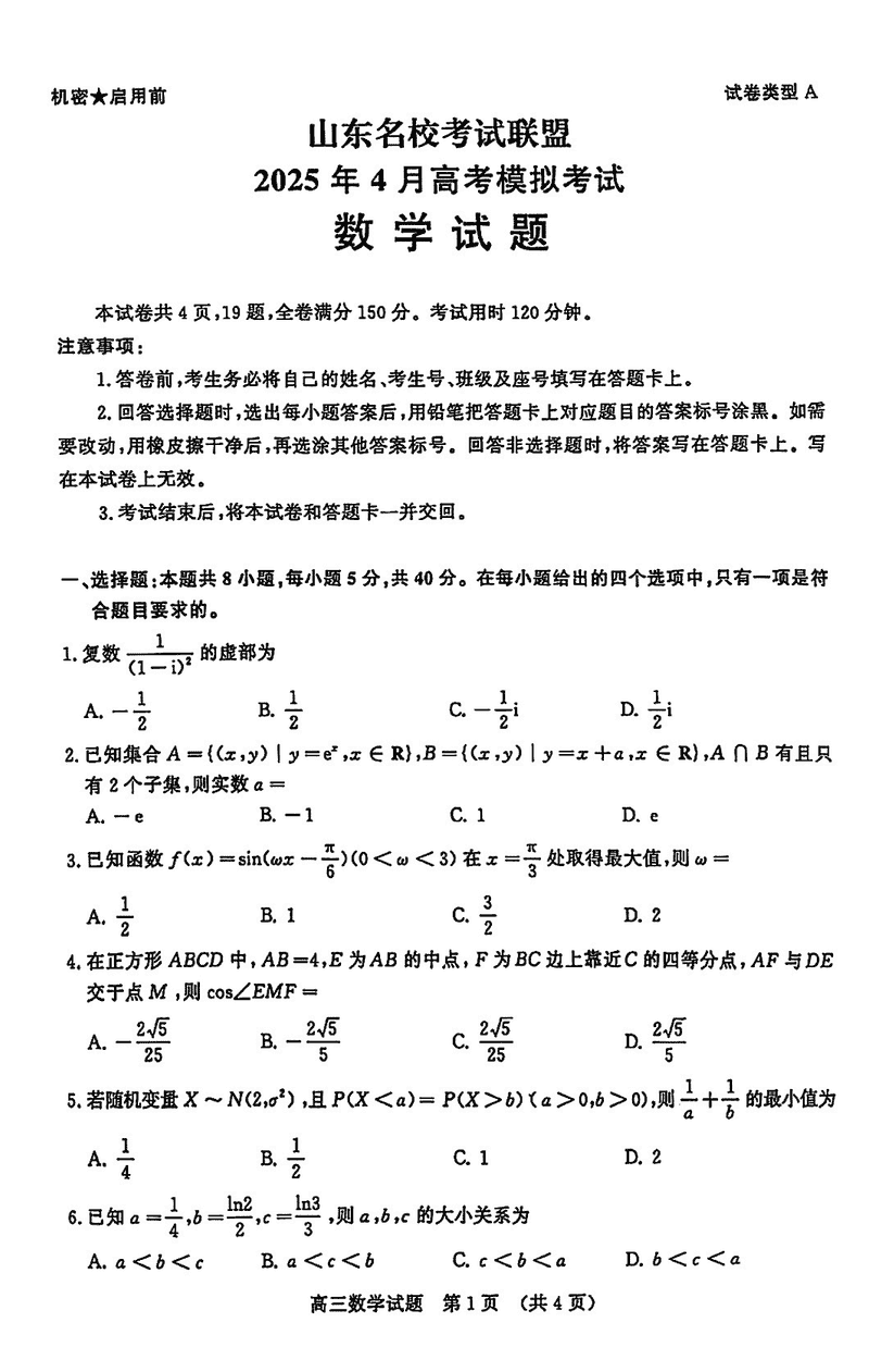 山东名校考试联盟2025年高三4月模考数学试题及答案 时间:2025-04-23 山东 数学试题 山东名校考试联盟2025年高三4月模考数学考试已于近日开考,为方便考生考后及时查看考试情况,查漏补缺、弥补不足,本文整理了试题答案解析相关信息! 汇总:山东名校考试联盟2025年高三4月模考试题及答案汇总 数学试题及答案解析