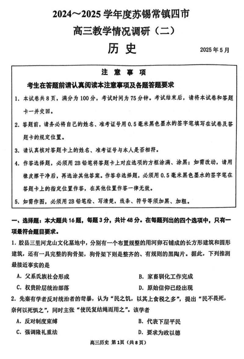 2024-2025学年苏锡常镇四市高三5月教学情况调研(二)历史考试已于近日开考,为方便考生考后及时查看考试情况,查漏补缺、弥补不足,本文整理了试题答案解析相关信息!