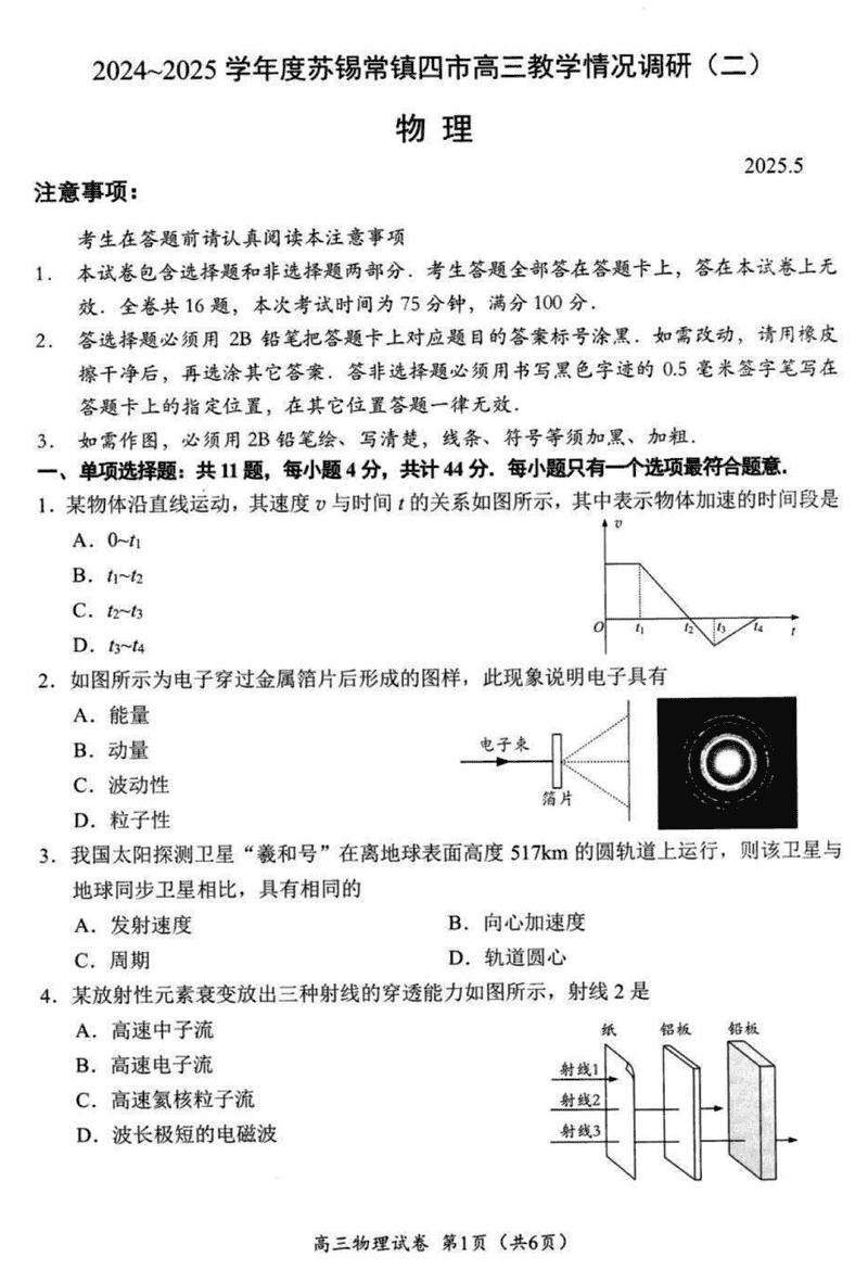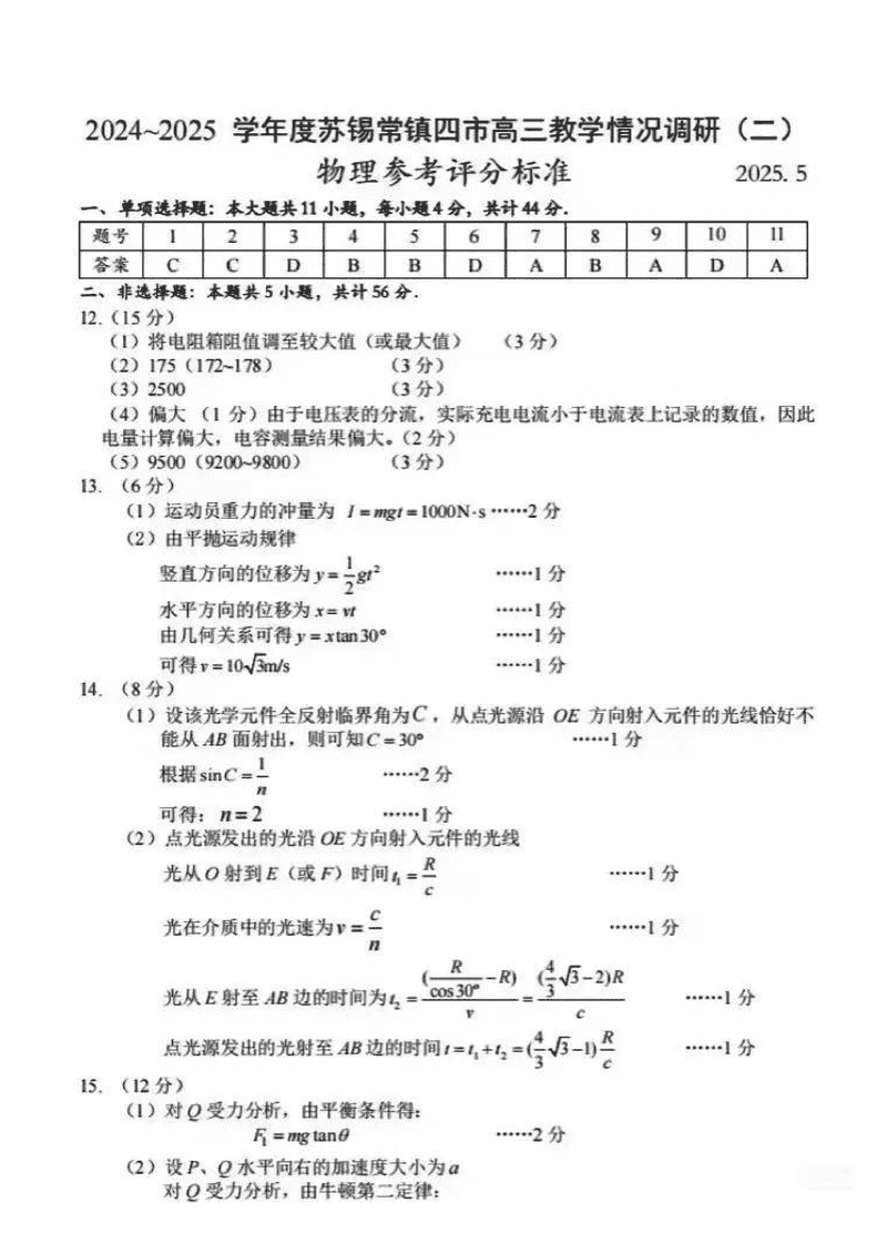 2024-2025学年苏锡常镇四市高三5月教学情况调研(二)物理考试已于近日开考,为方便考生考后及时查看考试情况,查漏补缺、弥补不足,本文整理了试题答案解析相关信息!