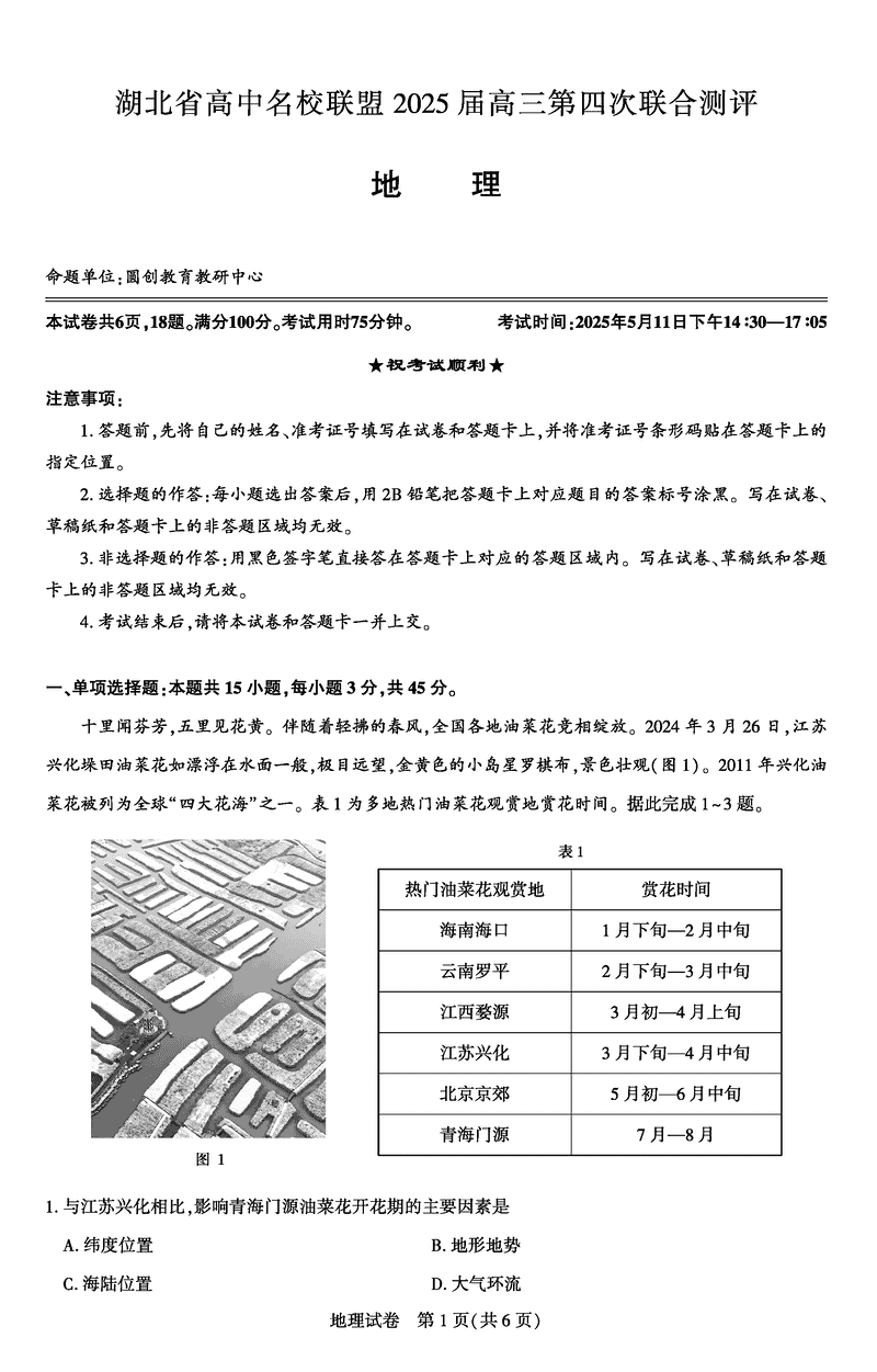 湖北圆创名校联盟2025届高三第四次联合测评地理考试已于近日开考,为方便考生考后及时查看考试情况,查漏补缺、弥补不足,本文整理了试题答案解析相关信息!
