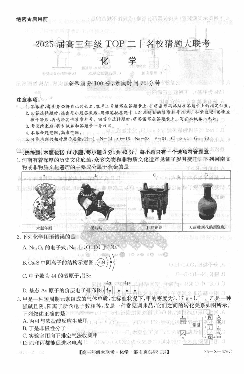 河南TOP二十名校2025届高三猜题大联考化学试题及答案