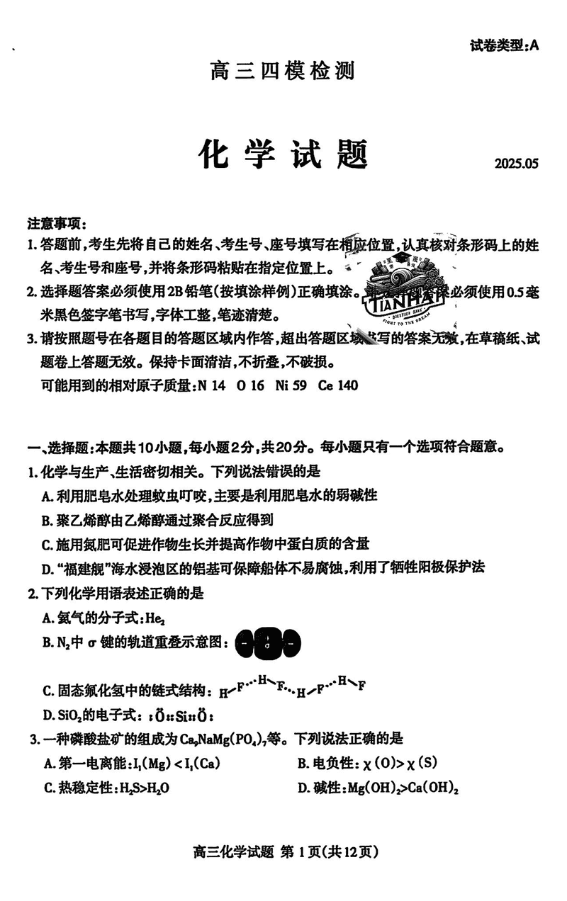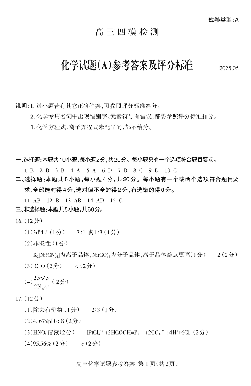 2025届山东泰安高三四模化学试题及答案 时间:2025-05-20 山东 理综试题 2025届山东省泰安高三四模化学考试已于近日开考,为方便考生考后及时查看考试情况,查漏补缺、弥补不足,本文整理了试题答案解析相关信息! 汇总:2025届山东省泰安高三四模检测试题及答案汇总 化学试题及答案解析
