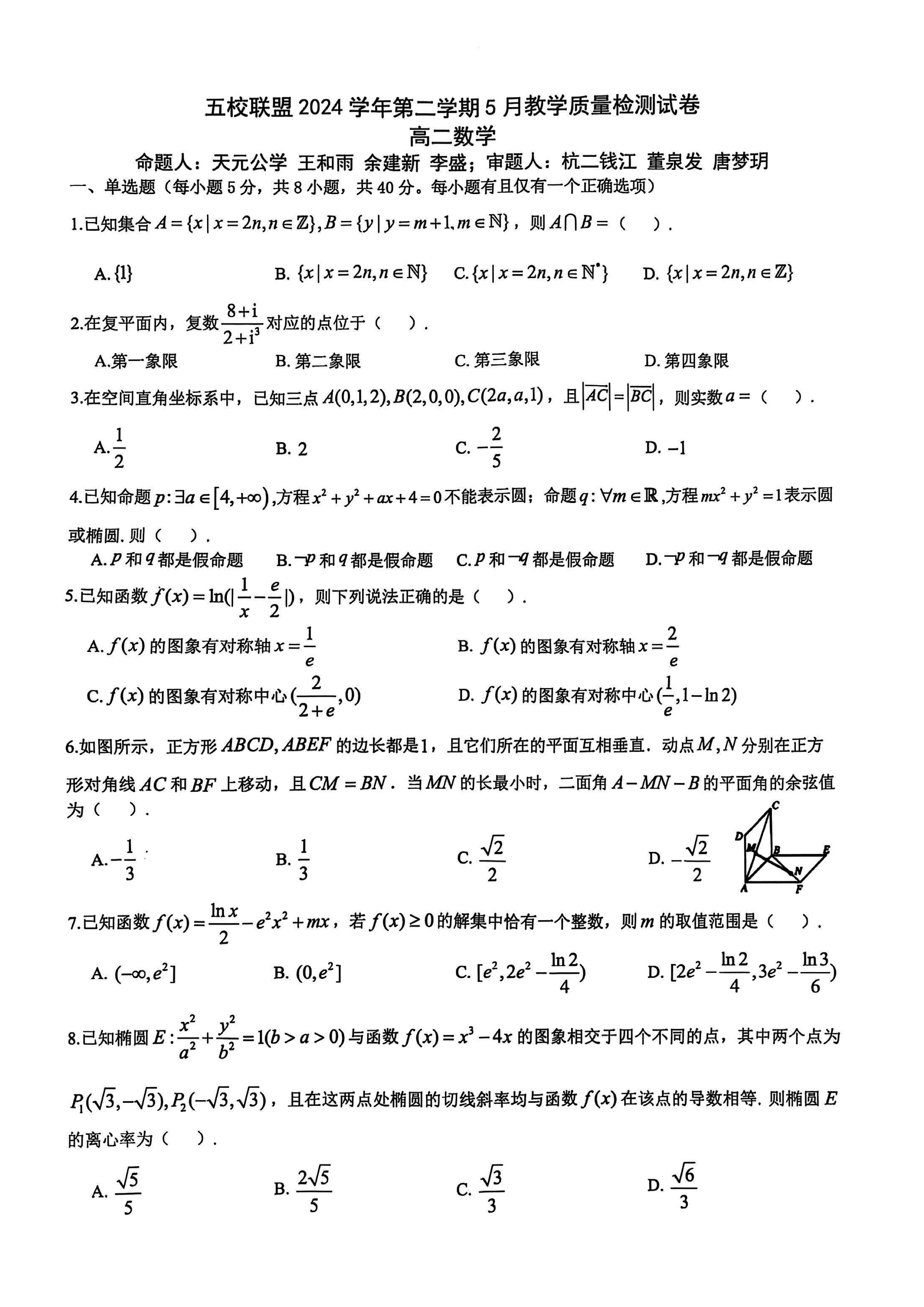 浙江省五校联盟2024-2025学年高二下学期5月质检数学试题及答案 时间:2025-05-22 浙江 高中数学 浙江省五校联盟2024-2025学年高二下学期5月质检数学考试已于近日开考,为方便考生考后及时查看考试情况,查漏补缺、弥补不足,本文整理了试题答案解析相关信息! 汇总: 数学试题及答案解析