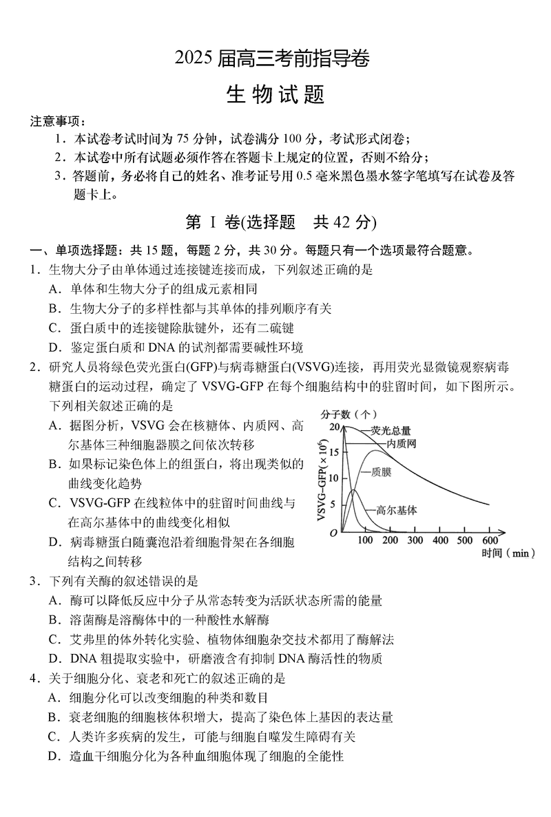 2025届江苏盐城高三下学期考前指导卷生物考试已于近日开考,为方便考生考后及时查看考试情况,查漏补缺、弥补不足,本文整理了试题答案解析相关信息!