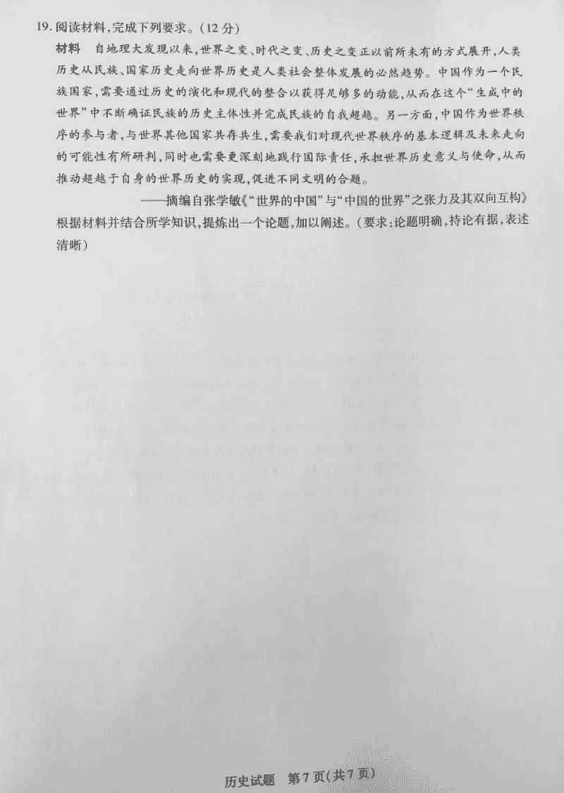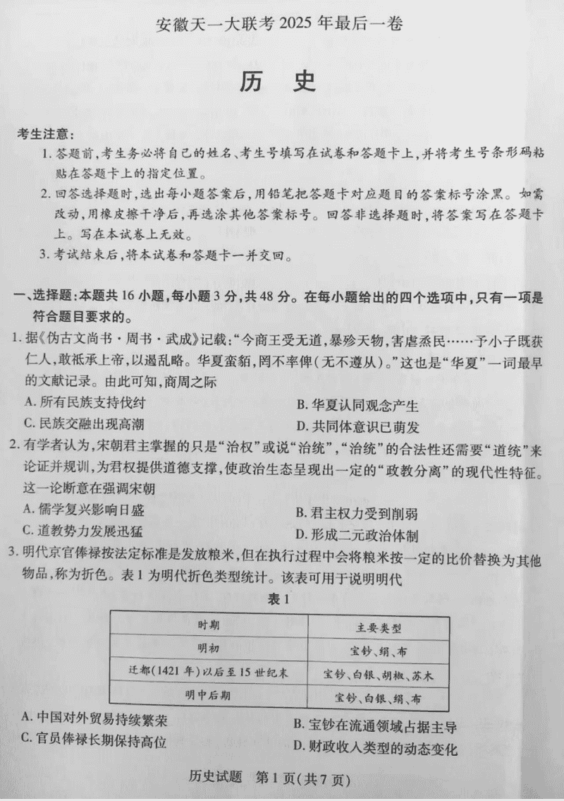 安徽天一大联考2025届高三最后一卷历史试题及答案