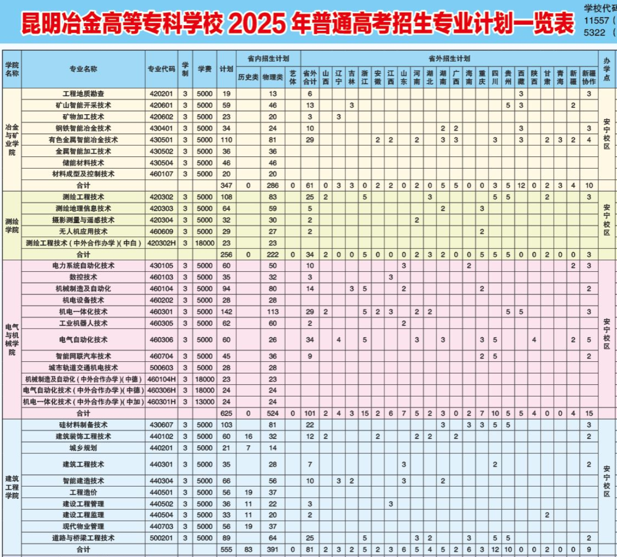 2025昆明冶金高等专科学校招生计划及各专业招生人数