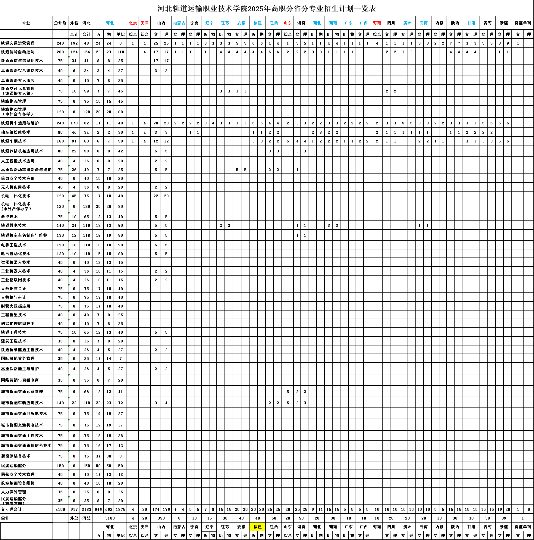 本文为大家整理的是河北轨道运输职业技术学院2025年招生计划,主要包含招生专业、招生类别、各专业招生人数等信息,希望对大家有所帮助,如有变动或异议,请以各省市教育考试院或学校公布的信息为准。