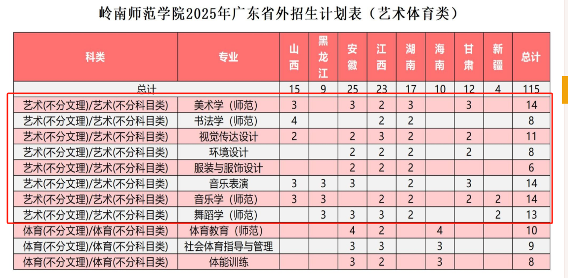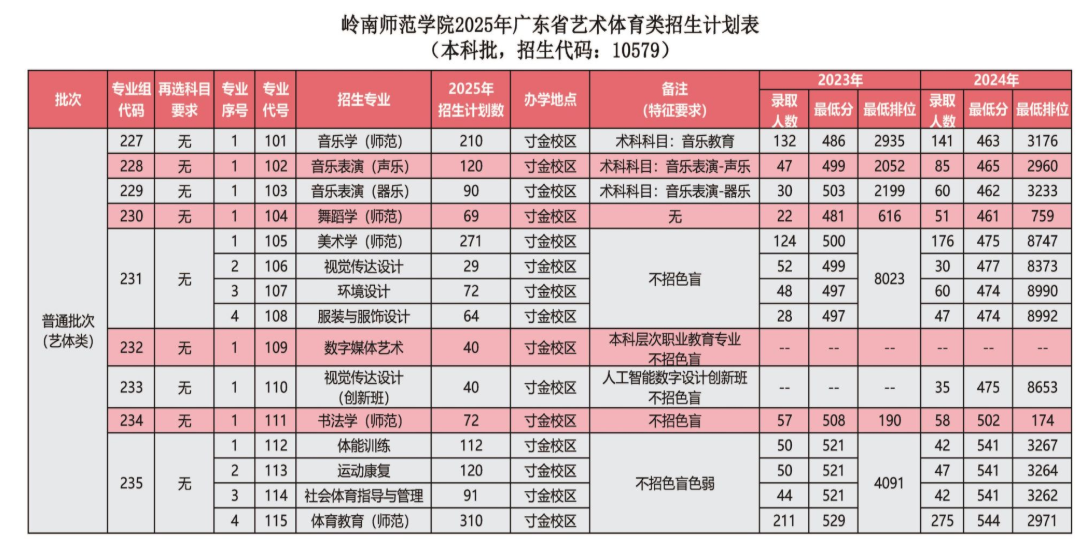 本文为大家整理的是岭南师范学院2025年艺术类招生计划,主要包含招生专业、各专业招生人数等信息,希望对大家有所帮助,如有变动或异议,请以各省市教育考试院或学校公布的信息为准。