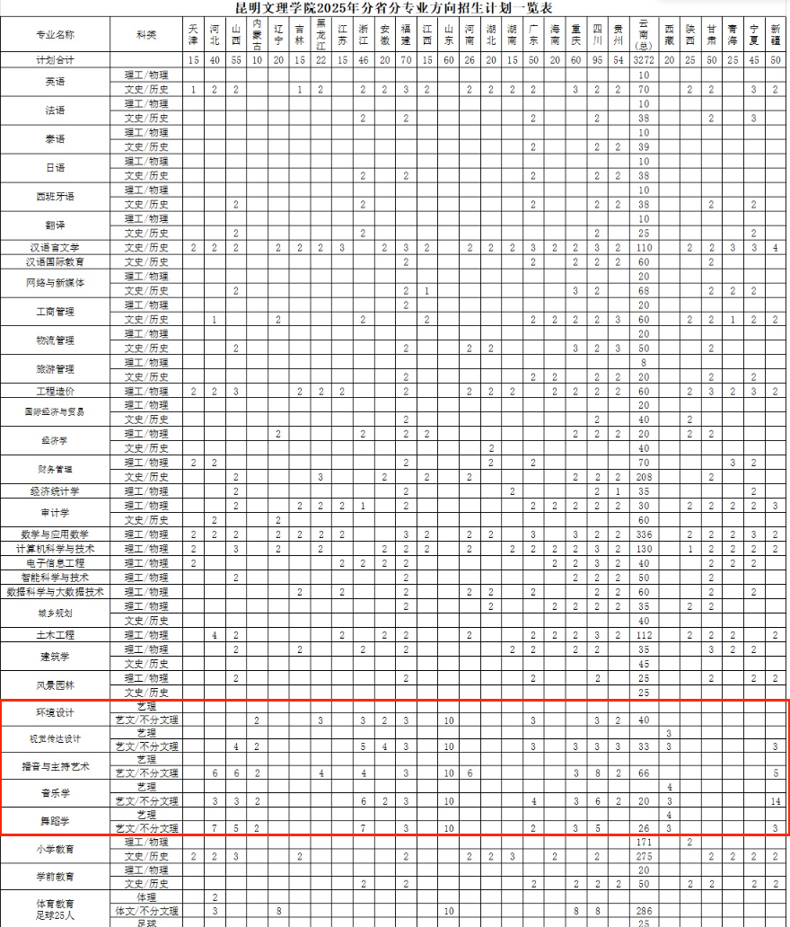 本文为大家整理的是昆明文理学院2025年艺术类招生计划,主要包含招生专业、各专业招生人数等信息,希望对大家有所帮助,如有变动或异议,请以各省市教育考试院或学校公布的信息为准。