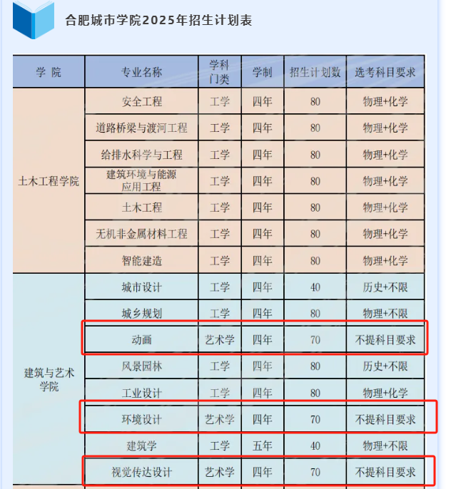 本文为大家整理的是合肥城市学院2025年艺术类招生计划,主要包含招生专业、各专业招生人数等信息,希望对大家有所帮助,如有变动或异议,请以各省市教育考试院或学校公布的信息为准。