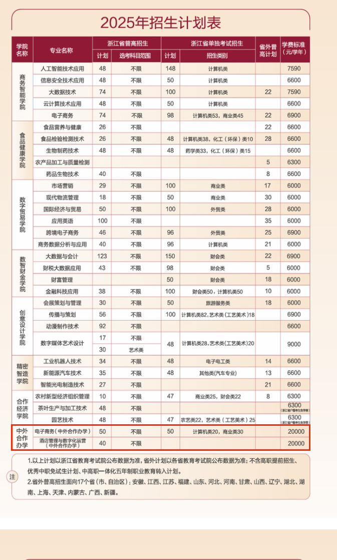 本文为大家整理的是浙江经贸职业技术学院2025年中外合作办学招生计划,主要包含招生专业、各专业招生人数等信息,希望对大家有所帮助,如有变动或异议,请以各省教育考试院和学校公布的信息为准。
