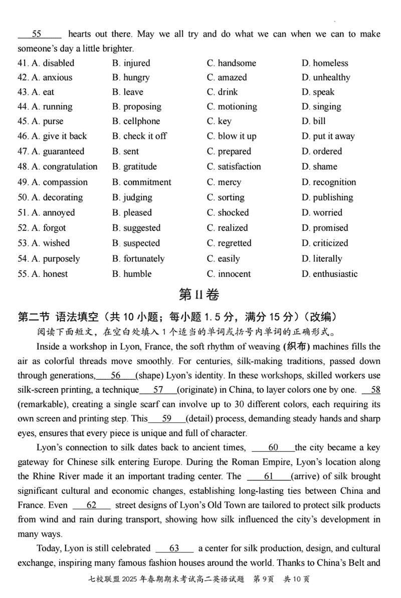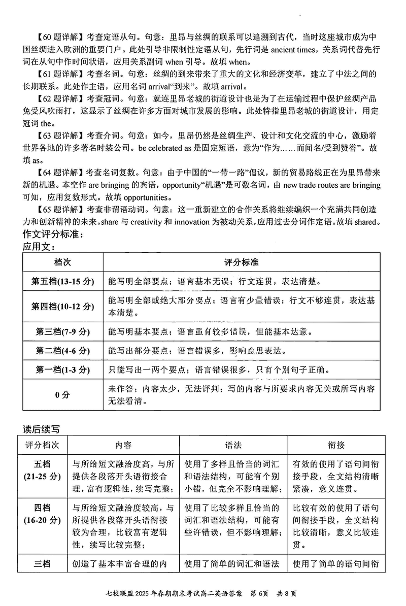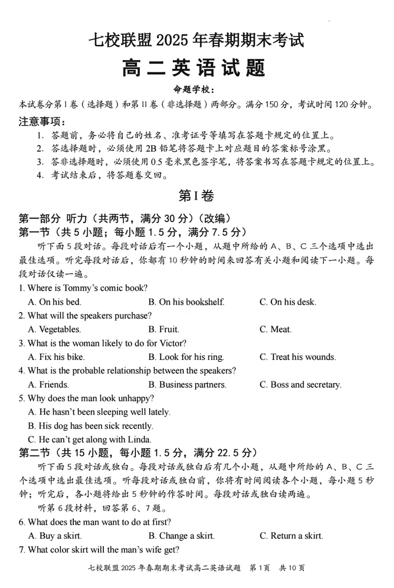 重庆市七校联盟2025年春期高二期末英语试题及答案 时间:2025-07-08 重庆 高中英语 重庆市七校联盟2025年春期高二年级期末考英语考试已于近日开考,为方便考生考后及时查看考试情况,查漏补缺、弥补不足,本文整理了试题答案解析相关信息! 英语试题及答案解析