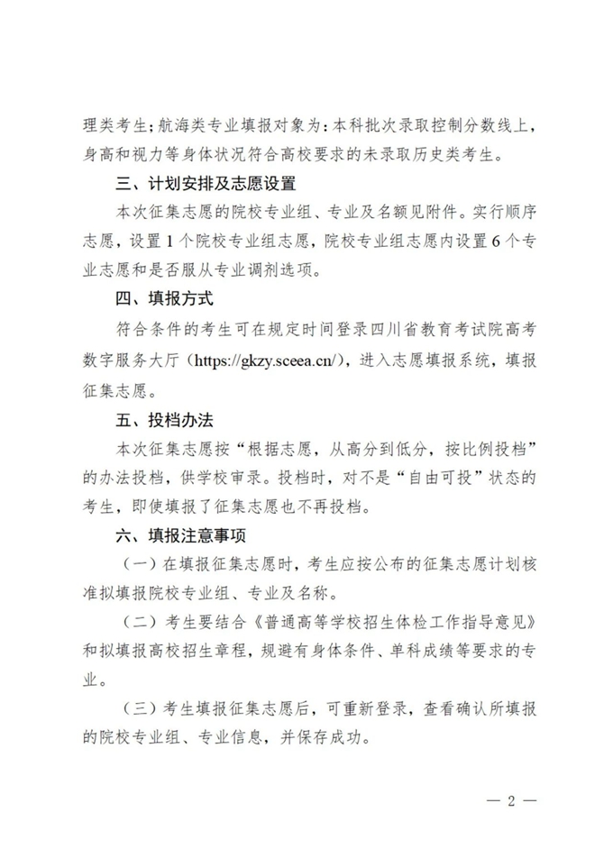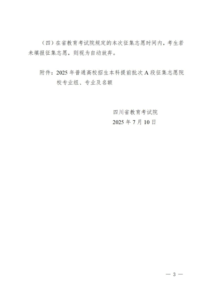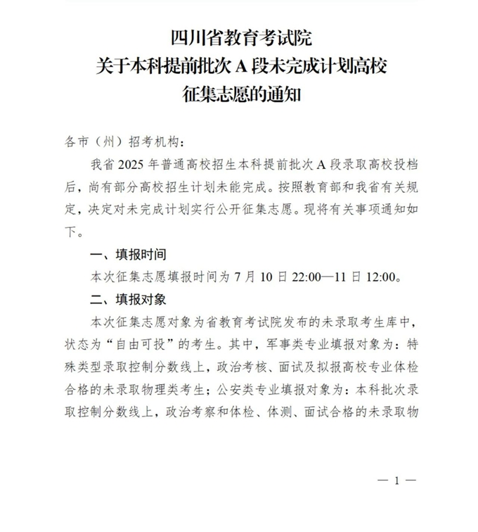 四川关于本科提前批次A段未完成计划高校征集志愿的通知