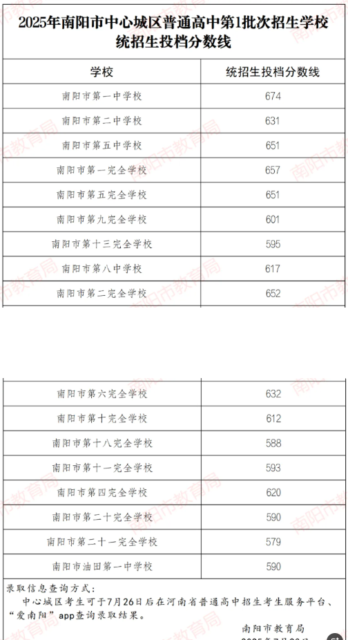 从南阳市教育局了解到,2025年河南南阳市中心城区普通高中第1批次招生学校统招生投档分数线和分配生分数线已公布,其中南阳市第一中学校统招生投档分数线为674分。具体如下: