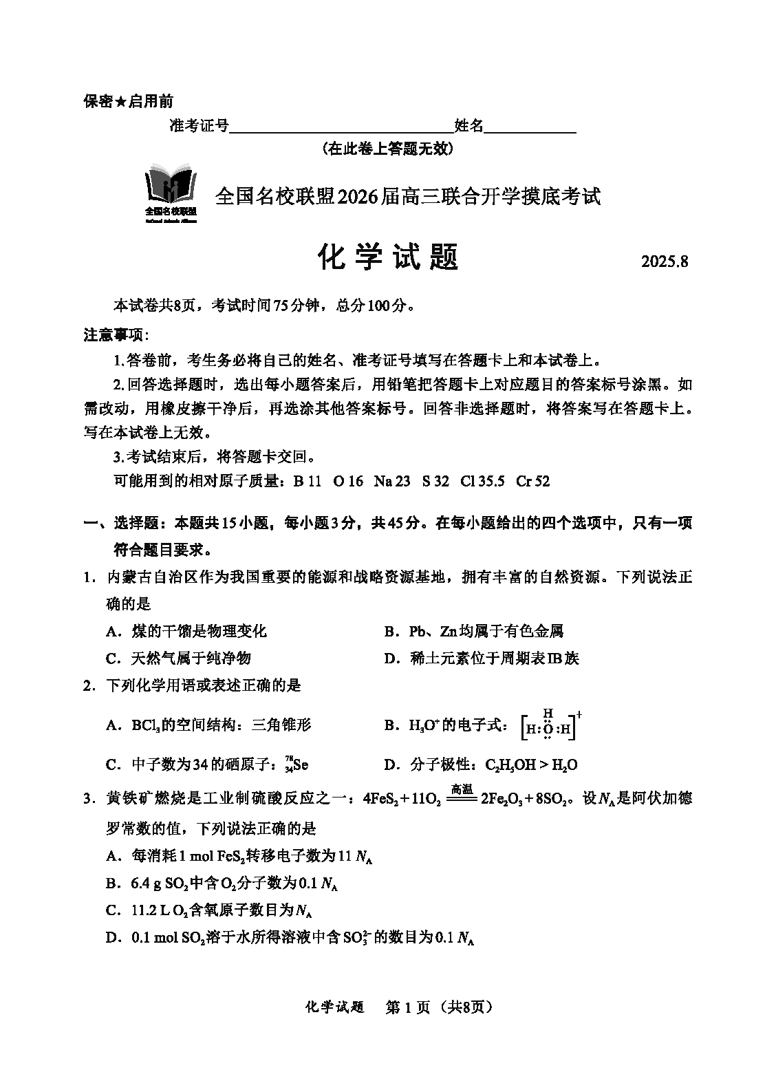 内蒙古-全国名校联盟2026届高三联合开学摸底化学试题及答案