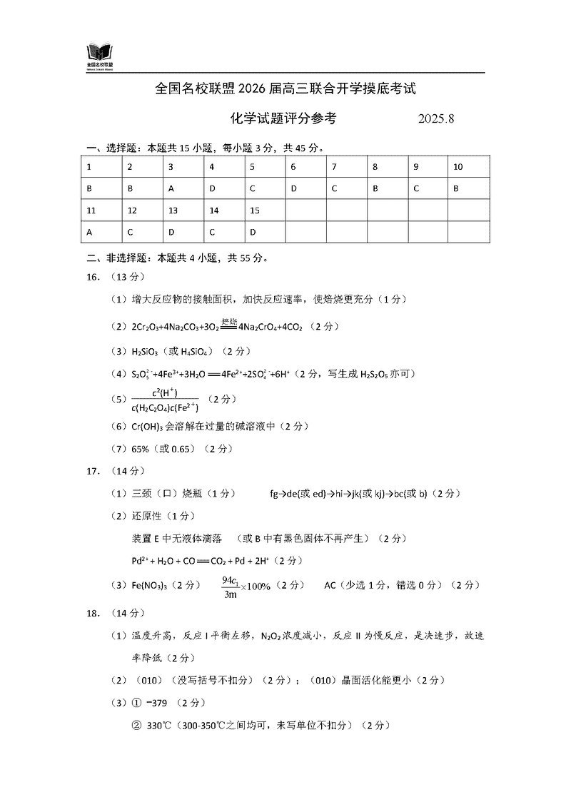 内蒙古-全国名校联盟2026届高三联合开学摸底化学考试已于近日开考,为方便考生考后及时查看考试情况,查漏补缺、弥补不足,本文整理了试题答案解析相关信息!